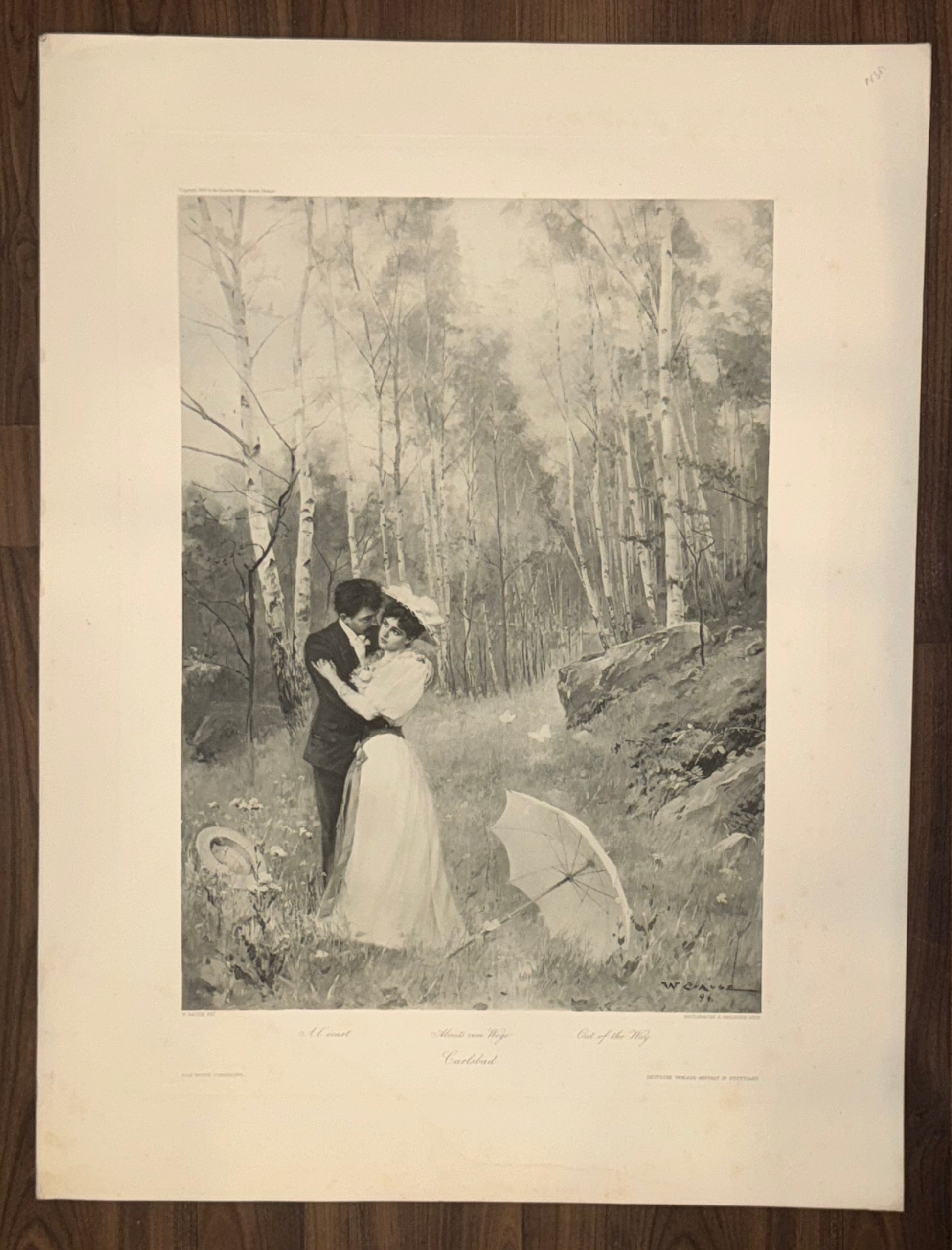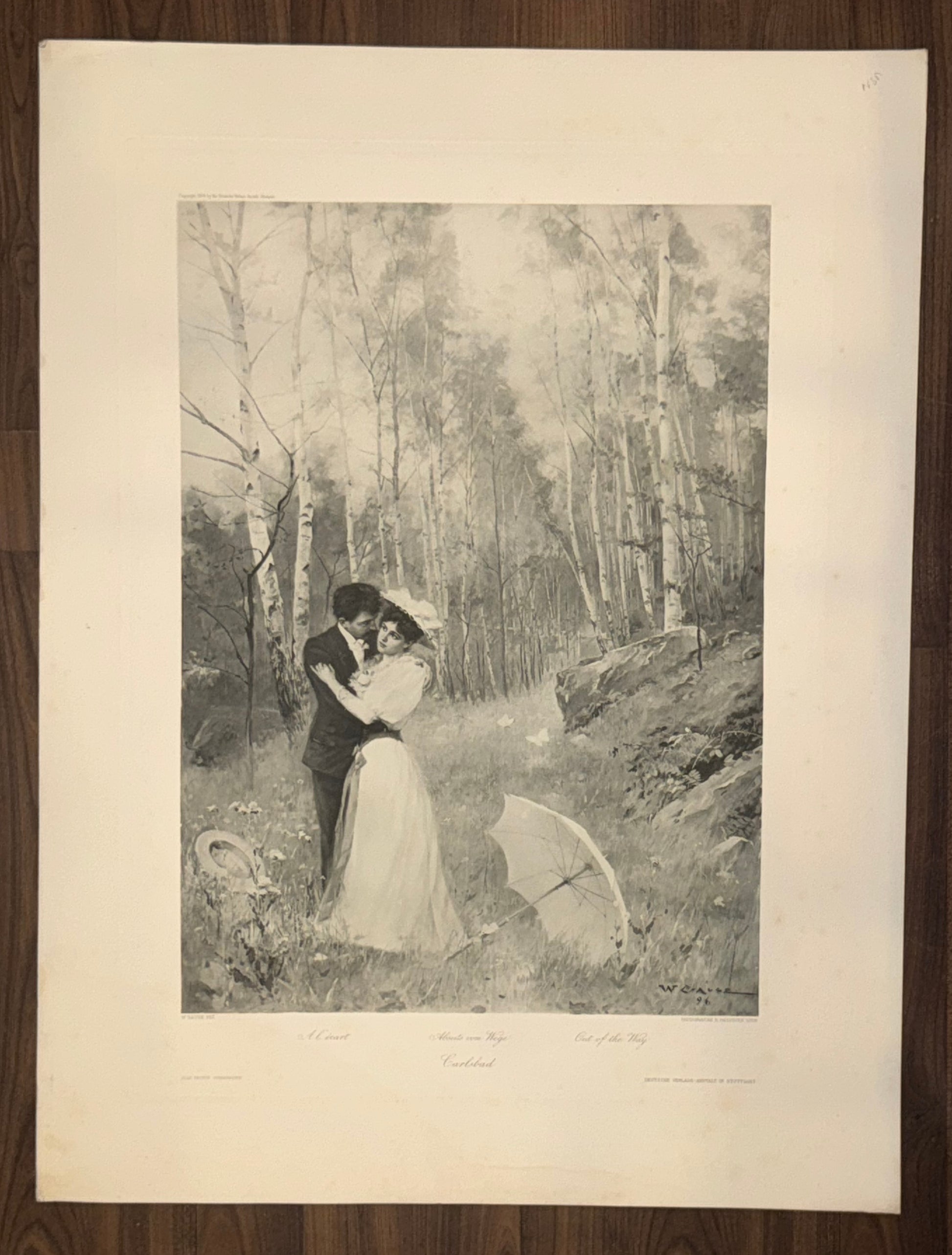 Ein eindrucksvolles Blatt, das eine intime Momentaufnahme im Kurort Karlsbad um 1890 zeigt. Vor der Kulisse eines hellen Birkenwaldes umarmt sich ein junges Paar – neben ihnen liegt ein Sonnenschirm und ein Damenhut, Zeichen eines Spaziergangs. Die Darstellung vereint Naturidylle mit romantischer Atmosphäre und spiegelt zugleich die gesellschaftlichen Facetten des mondänen Kurlebens wider.