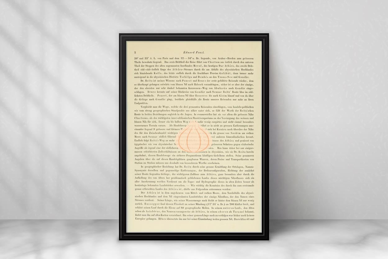 Unsere Drucke sind auf Seiten der Denkschriften der Akademie der Wissenschaften in Wien gefertigt, die über die Jahre eine wunderschöne elfenbeinfarbene Patina entwickelt haben. Mit einem Alter von mindestens 100 Jahren hat jede Seite ihren eigenen einzigartigen Charakter. Jeder Druck erfolgt direkt auf die einzelne Buchseite, sodass kein anderer das gleiche Stück wie du besitzen wird – ein echtes Unikat eben.