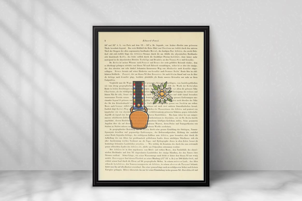 Unsere Drucke sind auf Seiten der Denkschriften der Akademie der Wissenschaften in Wien gefertigt, die über die Jahre eine wunderschöne elfenbeinfarbene Patina entwickelt haben. Mit einem Alter von mindestens 100 Jahren hat jede Seite ihren eigenen einzigartigen Charakter. Jeder Druck erfolgt direkt auf die einzelne Buchseite, sodass kein anderer das gleiche Stück wie du besitzen wird – ein echtes Unikat eben.