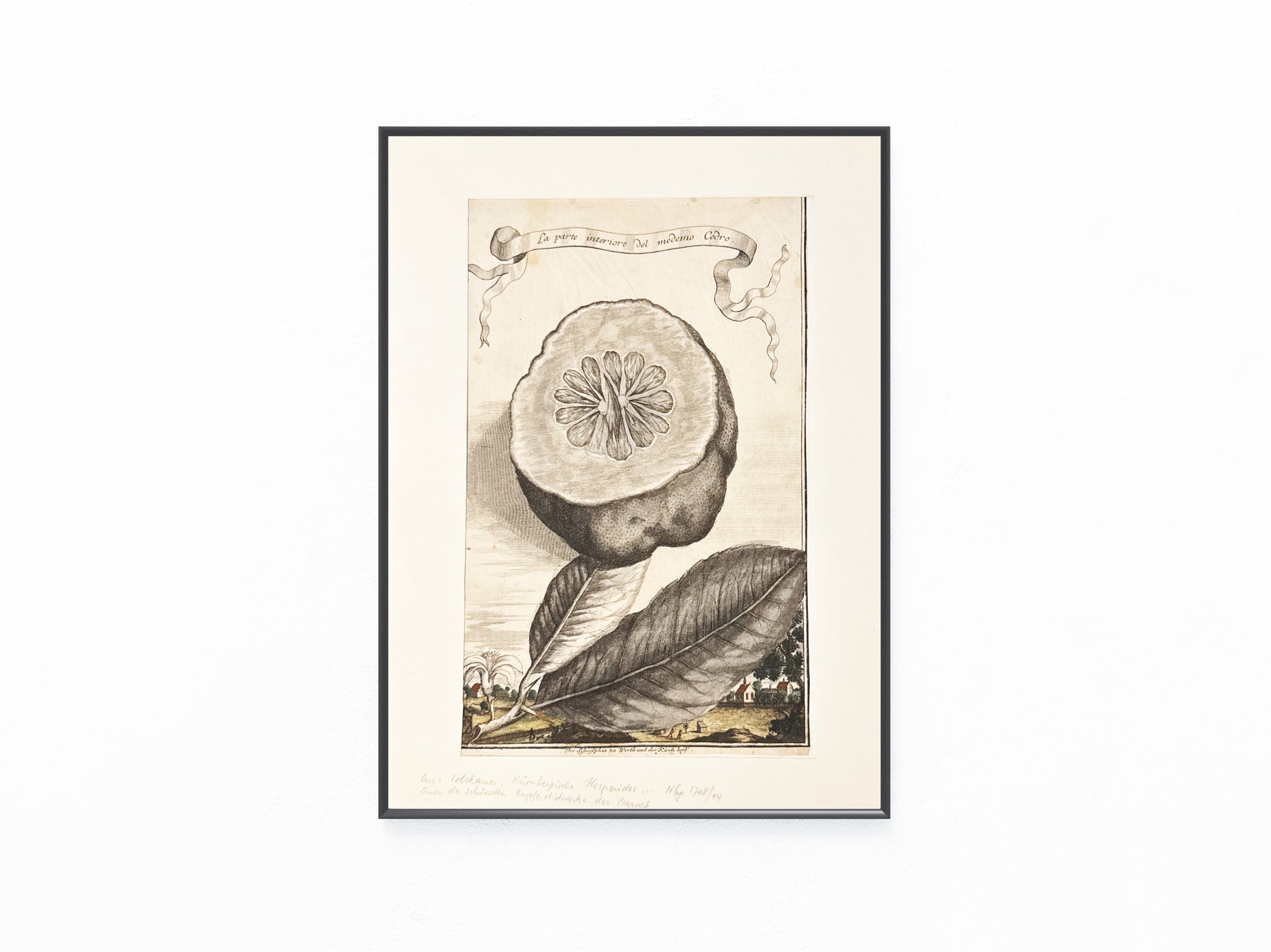 Seltene botanische Darstellung eines aufgeschnittenen Zedratzitronenfrucht aus der berühmten Zitrusmonografie „Nürnbergische Hesperides“ von Johann Christoph Volkamer. Der Kupferstich zeigt die Frucht in aufgeschnittener Ansicht mit der italienischen Beschriftung „La parte interiore del medemo Cedro“. Die feinen Linien des Stichs wurden sorgfältig von Hand koloriert. Am unteren Rand befindet sich der Druckvermerk „Herz. Hofkupferstich zu Wurtzb. und Ch. Fr. Fritzsch fec.“. Vermutlich handelt es sich um einen Nachdruck um 1800/1820, auf Kaschierkarton montiert.