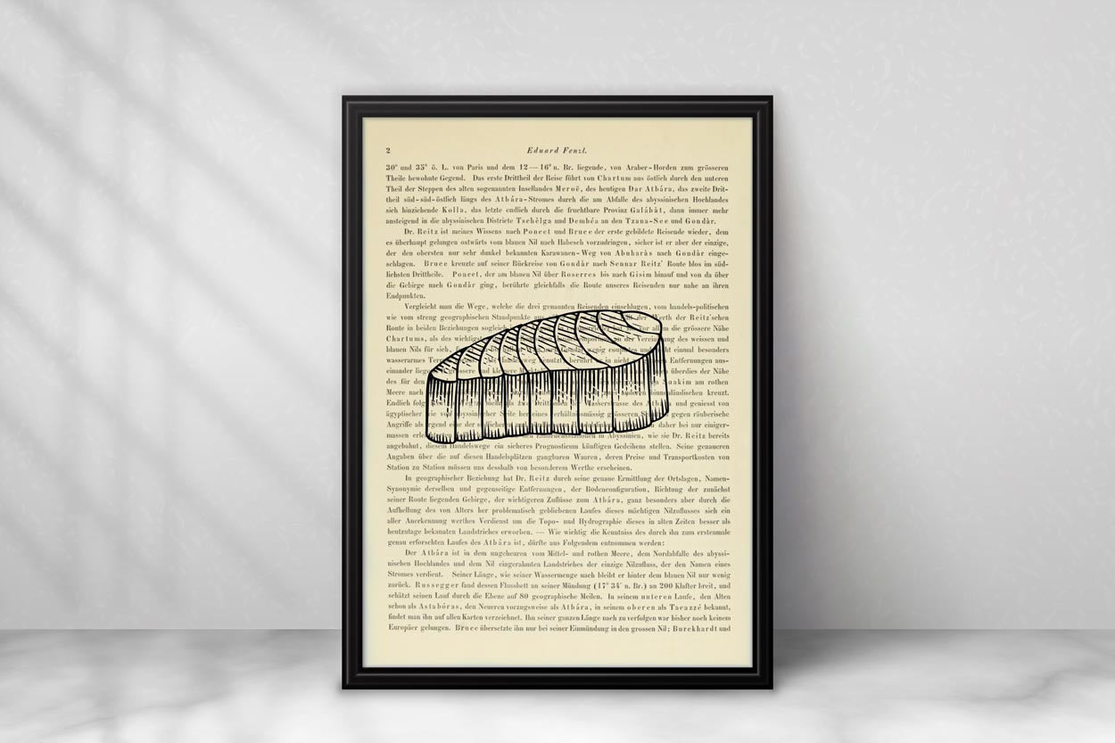 Unsere Drucke sind auf Seiten der Denkschriften der Akademie der Wissenschaften in Wien gefertigt, die über die Jahre eine wunderschöne elfenbeinfarbene Patina entwickelt haben. Mit einem Alter von mindestens 100 Jahren hat jede Seite ihren eigenen einzigartigen Charakter. Jeder Druck erfolgt direkt auf die einzelne Buchseite, sodass kein anderer das gleiche Stück wie du besitzen wird – ein echtes Unikat eben.