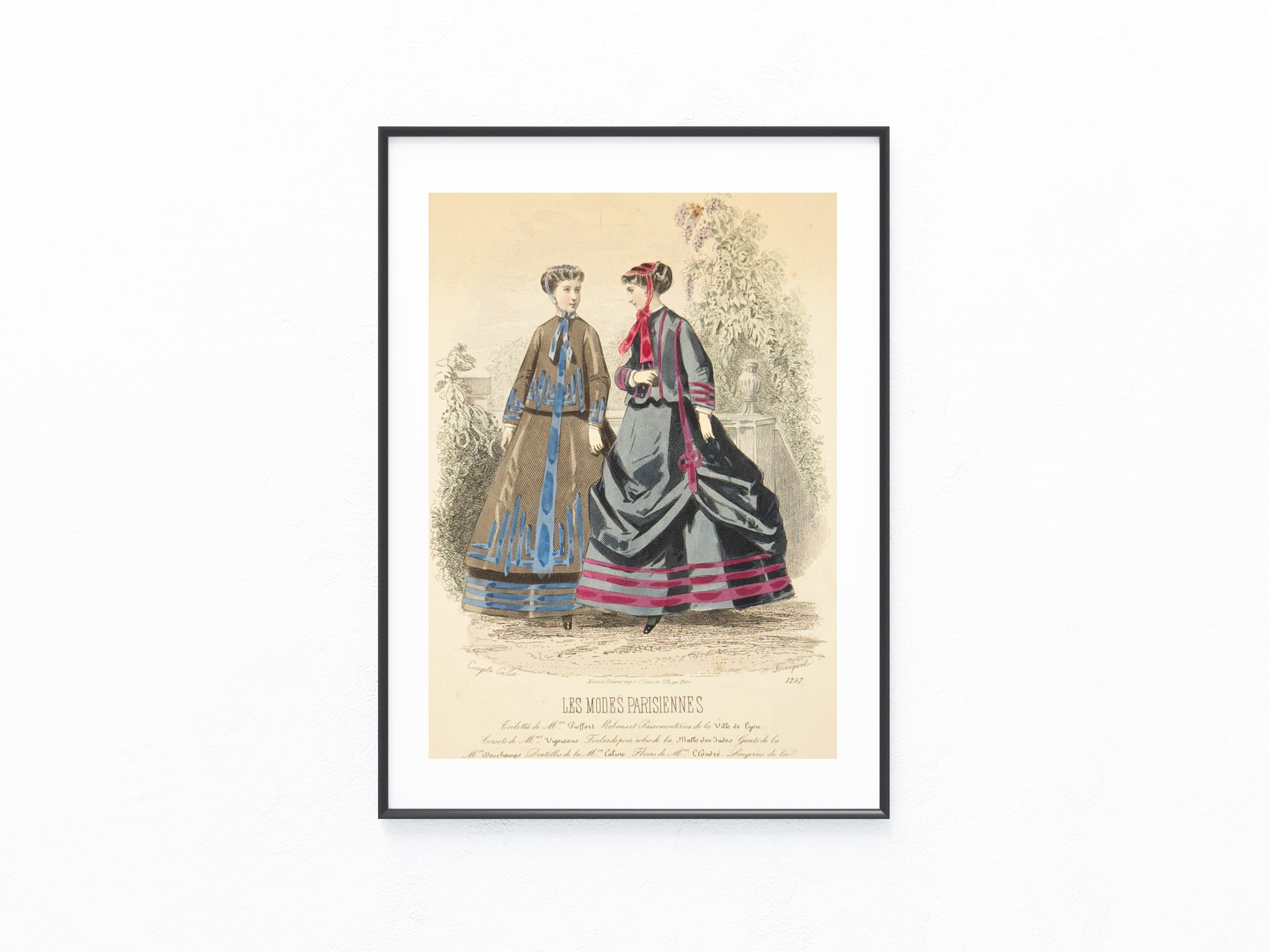 Handkolorierte Modegrafik aus der renommierten französischen Zeitschrift Les Modes Parisiennes, datiert mit 1857. Die Darstellung zeigt zwei Damen in eleganter Garderobe mit markanten Farbakzenten in Blau und Pink – ein klassisches Beispiel für die Pariser Modewelt der späten 1850er-Jahre. Mit dekorativem Hintergrund und feinem Detailreichtum.