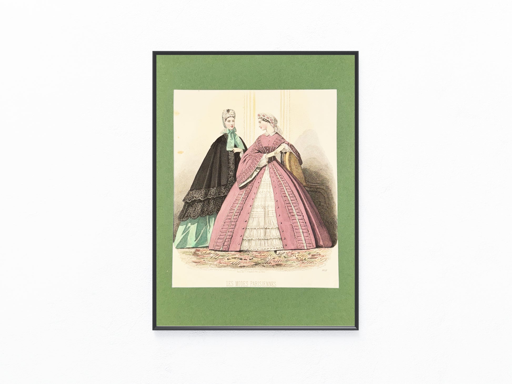 Wunderschön erhaltenes Modekupfer aus der renommierten Pariser Zeitschrift „Les Modes Parisiennes“, datiert mit der Jahreszahl 1863. Die Illustration zeigt zwei elegante Damen in prächtigen Crinolinenkleidern: links ein schwarz-grünes Ensemble mit aufwendig gearbeitetem Umhang und Haube, rechts ein roséfarbenes Kleid mit Spitzenunterrock und Blütenhaube. Die Szene spielt in einem feinen Interieur, das stilvoll angedeutet ist. Unter dem Bild finden sich detaillierte Hinweise auf die beteiligten Pariser Modehäuser.