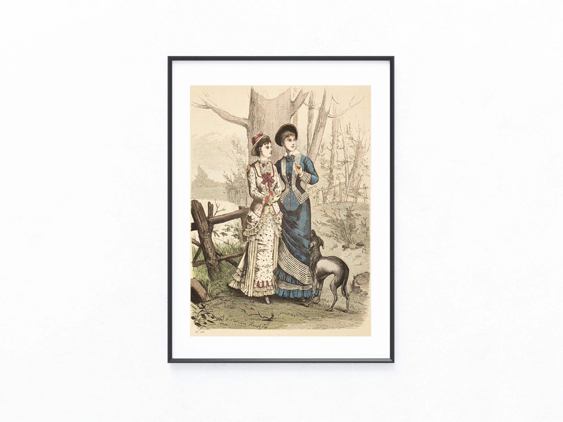 Lebendige, handkolorierte Modegrafik aus der Illustrierten Frauen-Zeitung, Ausgabe vom 12. Mai 1879. Die Darstellung zeigt zwei Damen in aufwendigen Frühlings- bzw. Sommergewändern beim Spaziergang im Wald – begleitet von einem Windhund. Die Kleidung ist geprägt von floralen Mustern, Volants, Tournüren und eleganten Accessoires wie Hut und Sonnenschirm.
