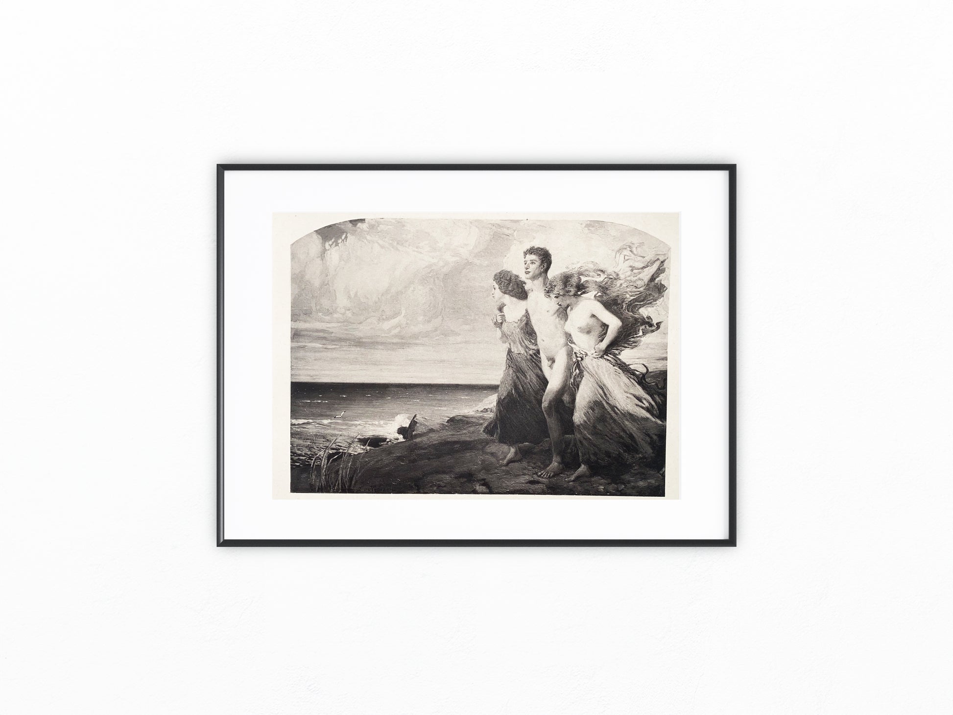 Originaldruck nach dem Werk Frühlingssturm von Ludwig von Hofmann (1861–1945), veröffentlicht um 1900 in der renommierten Kunstzeitschrift PAN. Dargestellt ist eine dynamische Szene am Meer: ein junger Mann und zwei weibliche Figuren, vom Wind erfasst, schreiten kraftvoll über die Küste. Hofmanns Arbeiten gelten als bedeutende Verbindung von Jugendstil, Symbolismus und klassizistischen Anklängen.