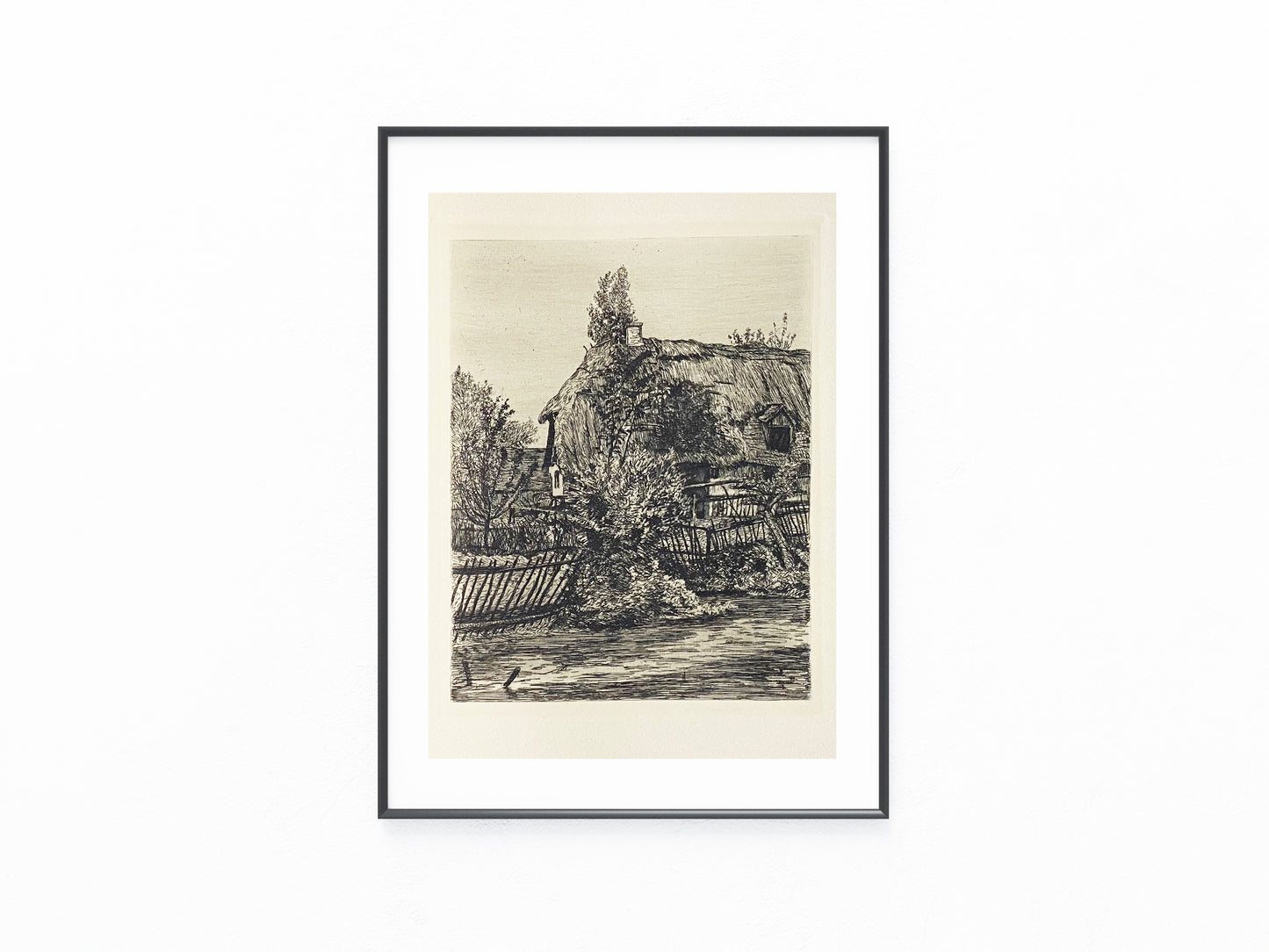 Meyer-Basel Strohhütte in Oberbayern 1900 | Original Radierung Bayern Bauernhaus