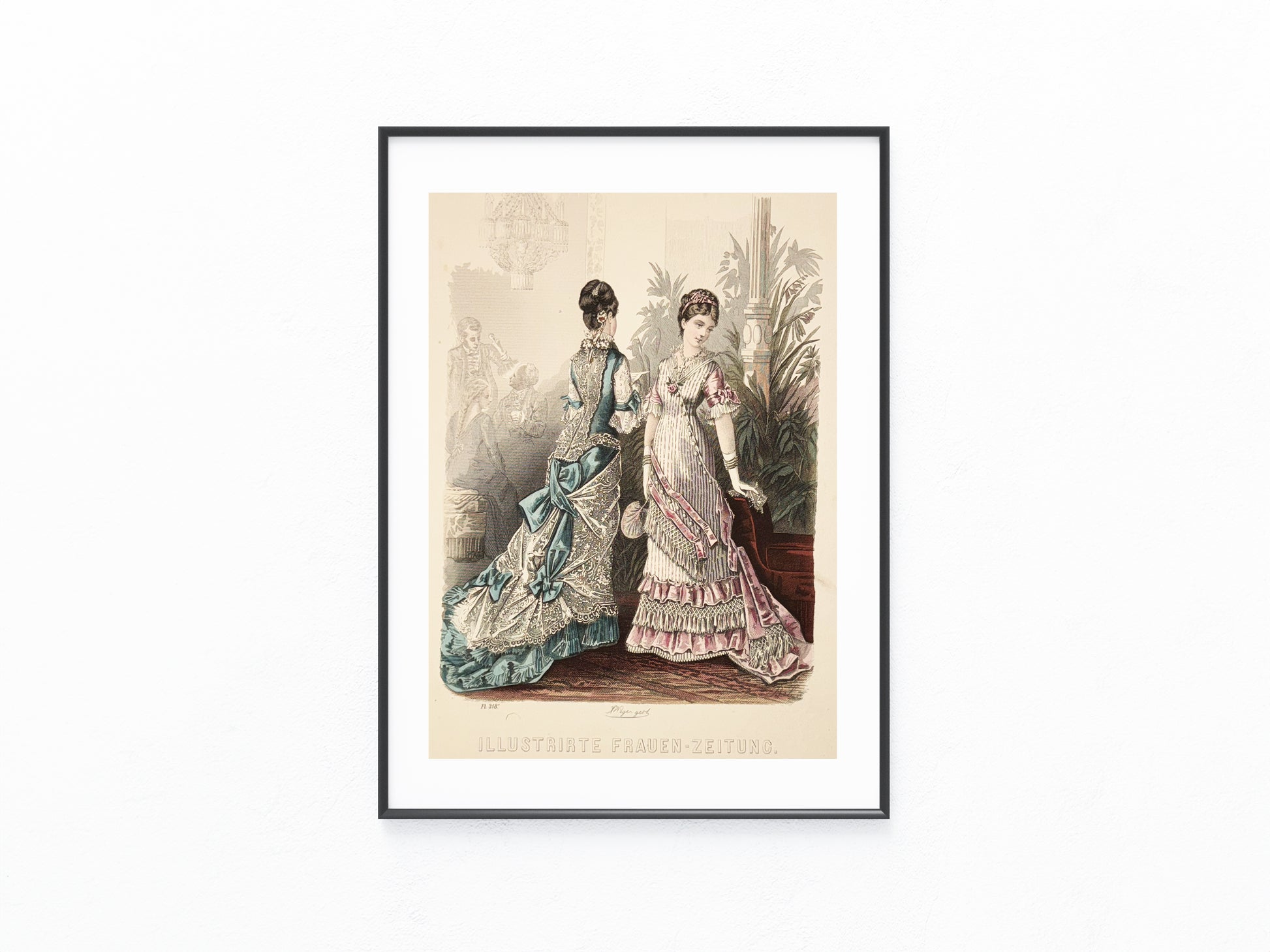 Elegante handkolorierte Lithografie aus der Illustrierten Frauen-Zeitung, erschienen am 19. März 1877. Zwei modisch gekleidete Damen in opulenten Abendroben stehen im Mittelpunkt der Szene, die in einem prunkvollen Salon mit Pflanzen, Lüster und Gesellschaft im Hintergrund spielt. Ein meisterhaftes Zeugnis der Modekultur des Historismus.