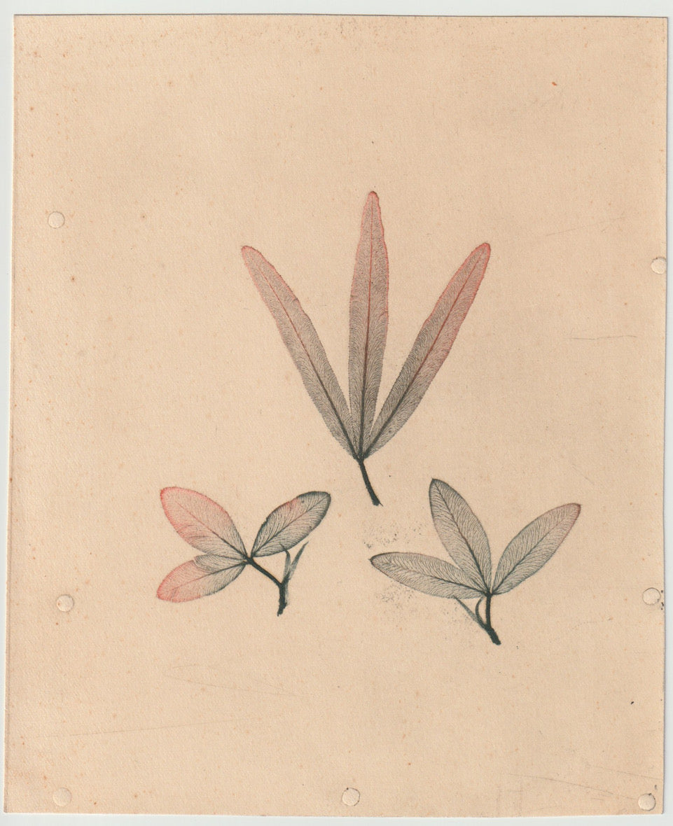 Dieser ausdrucksstarke Naturselbstdruck zeigt drei unterschiedliche Blattformen, nebeneinander angeordnet und in tiefem Rot- und Schwarzdruck fein abgebildet. Die Blattadern, Konturen und Texturen sind klar und präzise wiedergegeben – ein charakteristisches Beispiel für diese drucktechnisch anspruchsvolle Methode mit echtem Pflanzenmaterial.