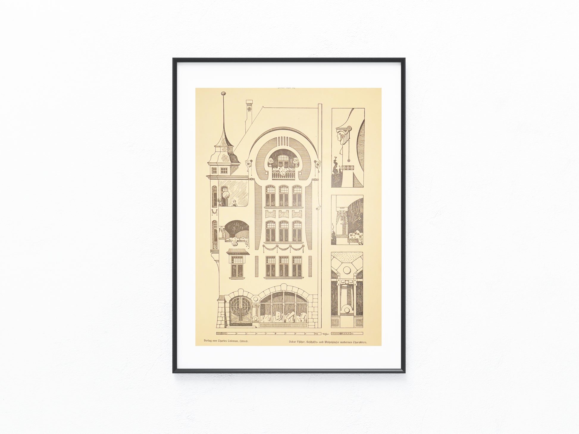 Fein ausgearbeitete Architektur-Tafel „Eckhaus“, um 1900 erschienen im Verlag Charles Coleman, Lübeck. Gezeigt wird ein markantes Jugendstil-Eckgebäude mit asymmetrischer Fassade, hohen Rundbogenöffnungen, Türmchen und dekorativen Details. Ergänzend sind Ornamentstudien und architektonische Details abgebildet – ein eindrucksvolles Beispiel der Baukunst dieser Epoche.