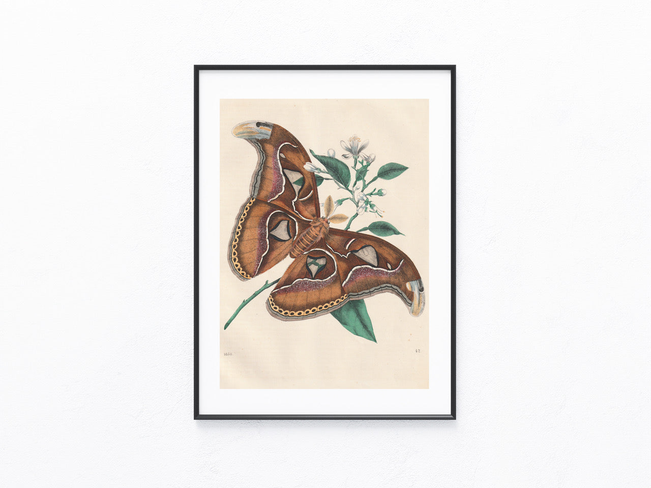 Prachtvolle Original-Lithografie aus dem Jahr 1858, kein Nachdruck! Der imposante Atlasspinner – einer der größten Falter der Welt – in detailreicher Darstellung auf zarter Blüte.
