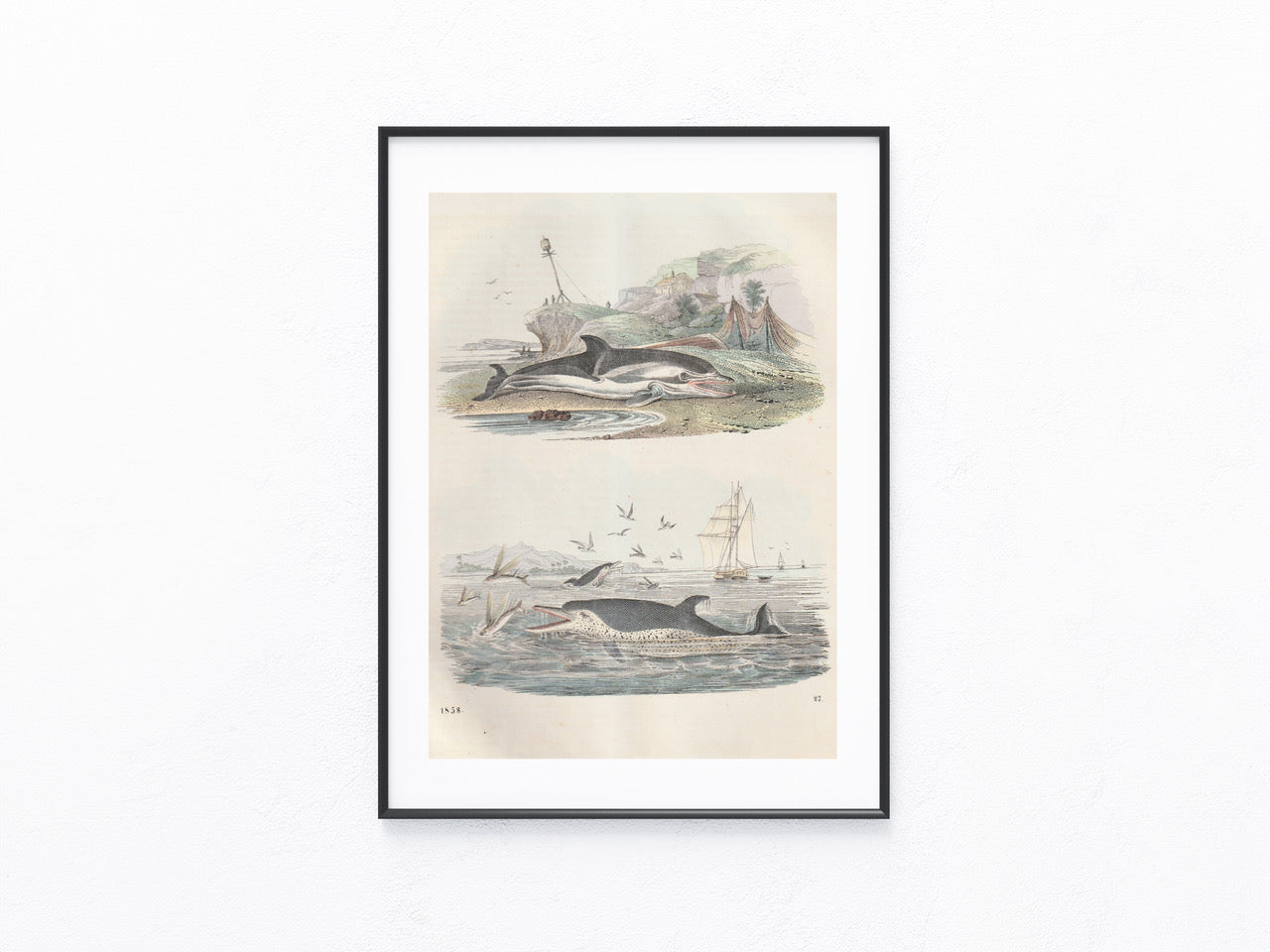 Zweifache Szenerie aus dem Jahr 1858 mit detailverliebter Darstellung verschiedener Delfine. Oben an Land gestrandet, unten lebendig jagend im Meer – diese Tafel zeigt zwei kontrastreiche Lebensmomente der Meeressäuger. Tafelnummer 27.