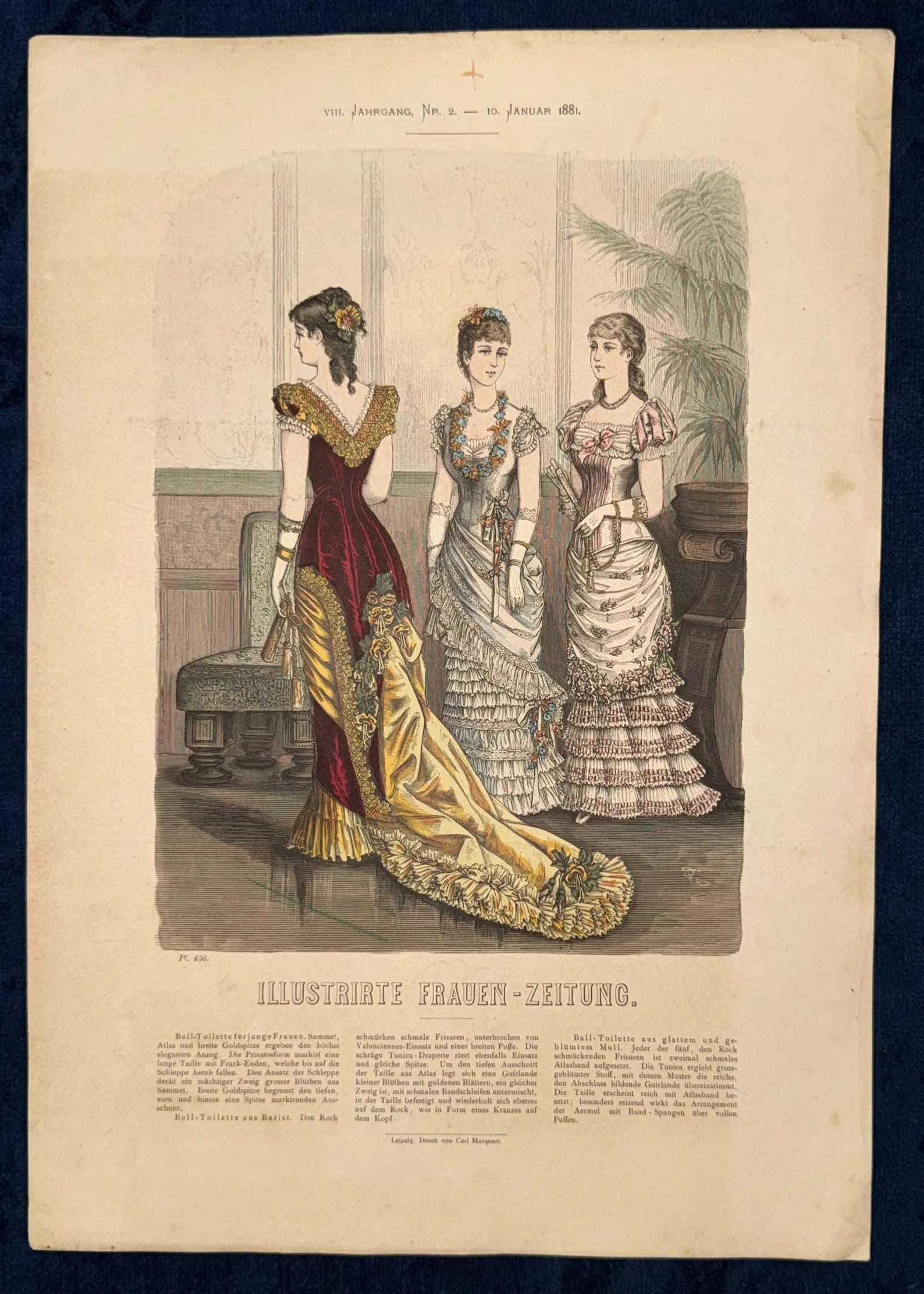 Originale kolorierte Modegrafik aus der Illustrierten Frauen-Zeitung, Ausgabe vom 10. Januar 1881. Drei Damen präsentieren festliche Ballkleider in opulenten Stoffen, Spitze und Schleppen – eine Szene voll Glanz und Eleganz aus der Hochblüte der Gründerzeit.