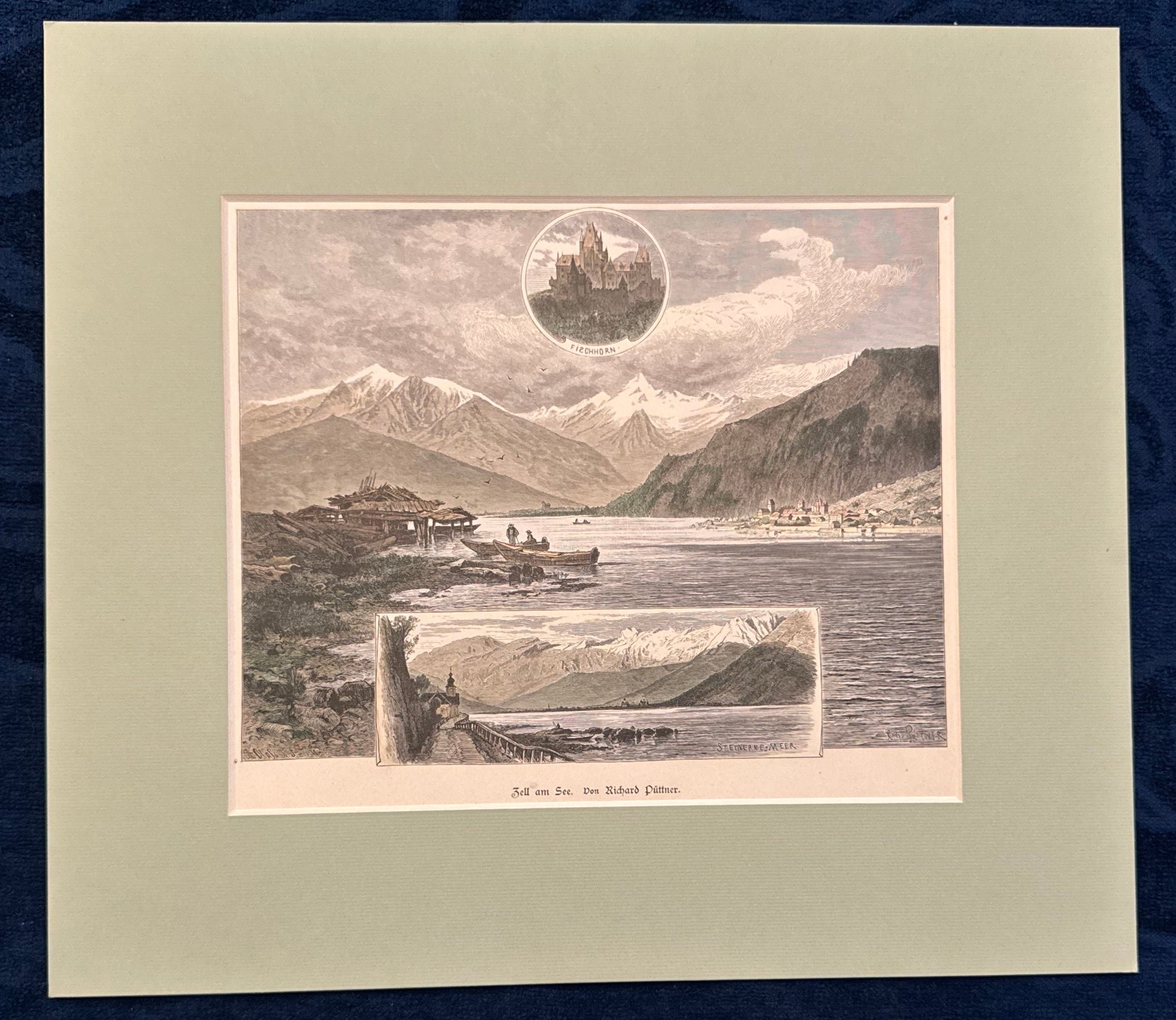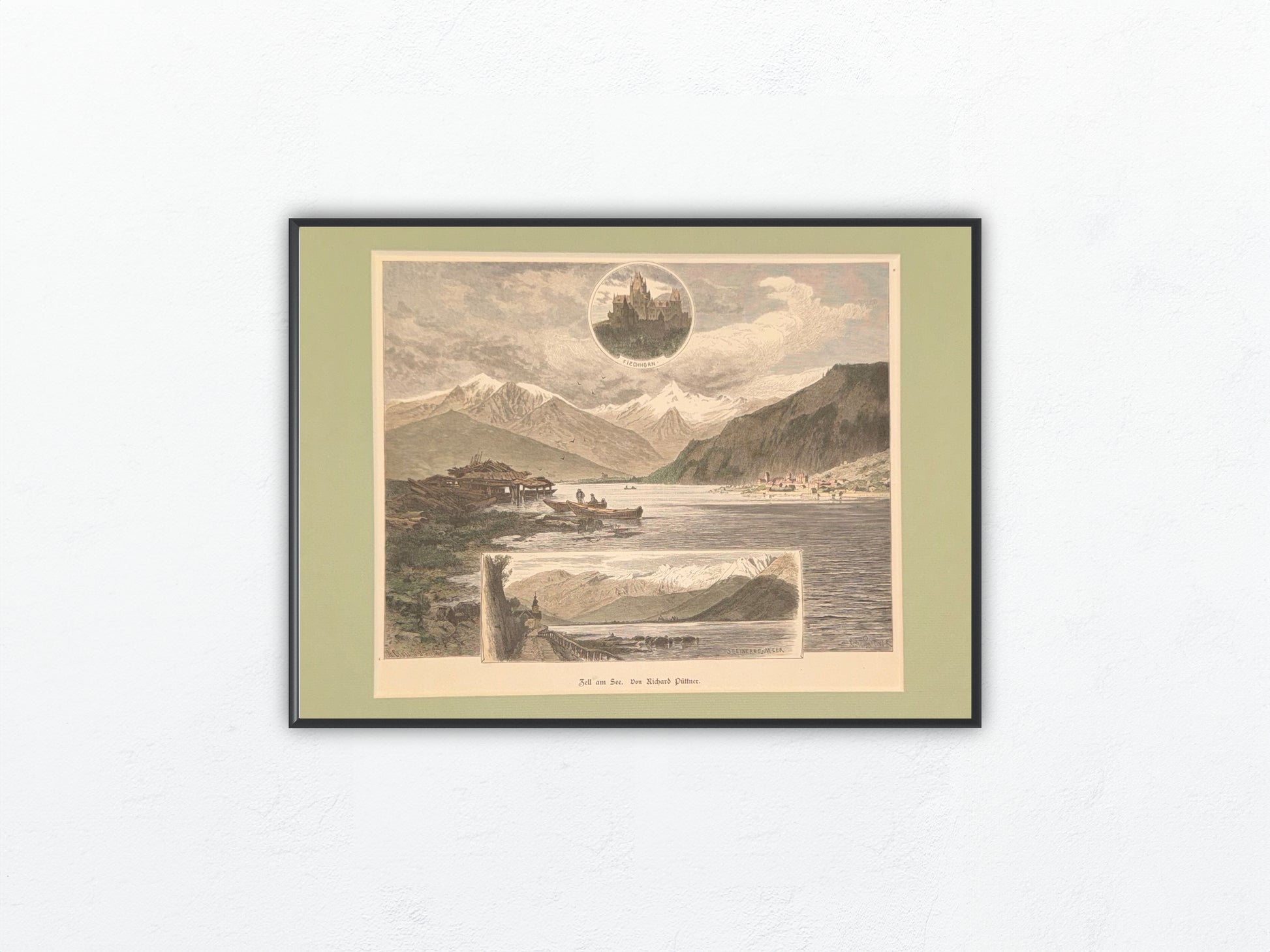 Stimmungsvolle Original-Ansicht von Zell am See, gezeichnet von Richard Püttner und aufwendig altkoloriert. Der fein detaillierte Holzstich zeigt eine lebendige Szenerie mit Booten, Bergen und Stadtsilhouette, ergänzt durch zwei Vignetten – darunter ein Rundbild mit Schloss Lichtenberg. Die Darstellung stammt aus einer illustrierten Zeitschrift des späten 19. Jahrhunderts und ist heute ein begehrtes Zeitdokument alpiner Landschaftskunst.