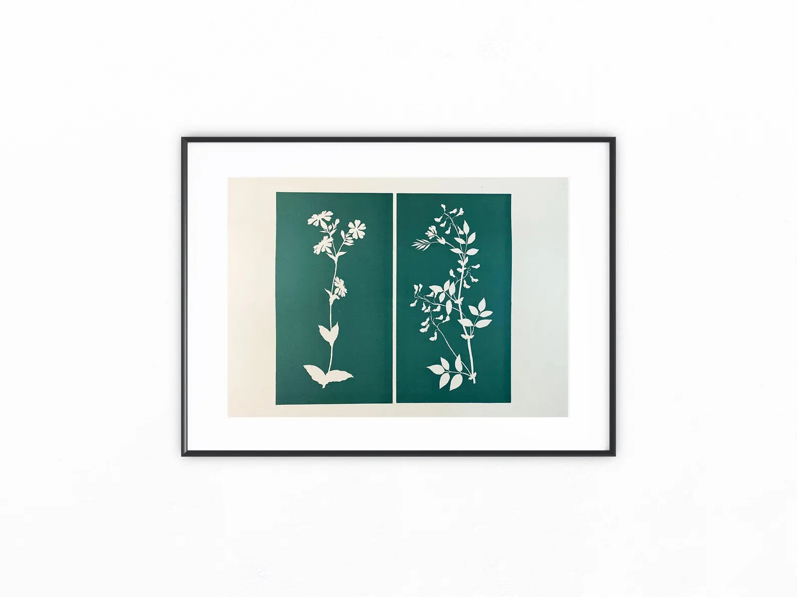 Originaldruck um 1900 mit zwei Pflanzenstudien nach Photogrammen von Ph. O. Runge (Pflanzenstudien mit Scheere und Papier um 1805). Die feinen Silhouetten der Blüten- und Blätterformen heben sich in Weiß eindrucksvoll vom tiefgrünen Hintergrund ab – ein faszinierendes Beispiel für die Verbindung von Naturwissenschaft und Kunst in der zweiten Hälfte des 19. Jahrhunderts.