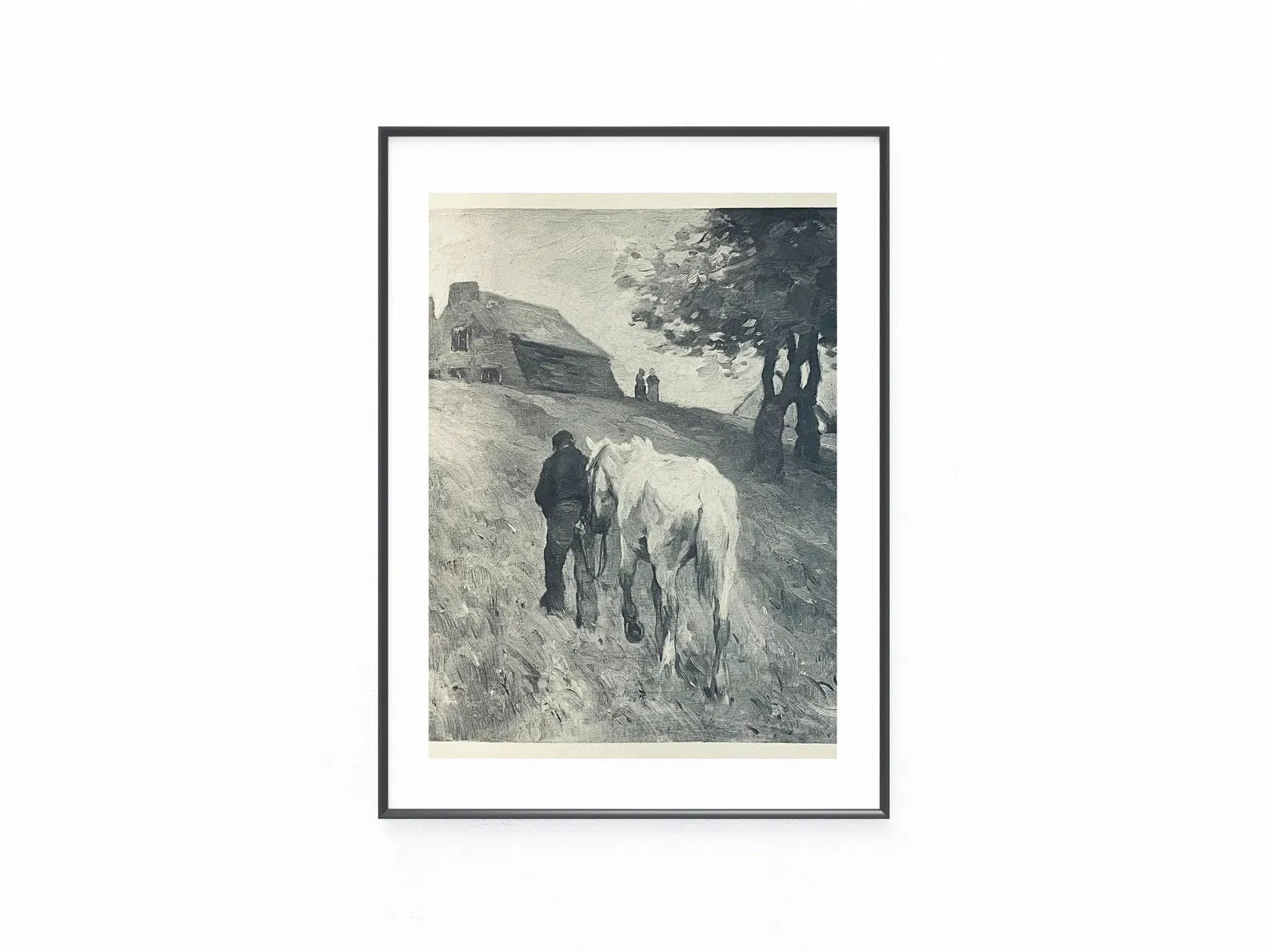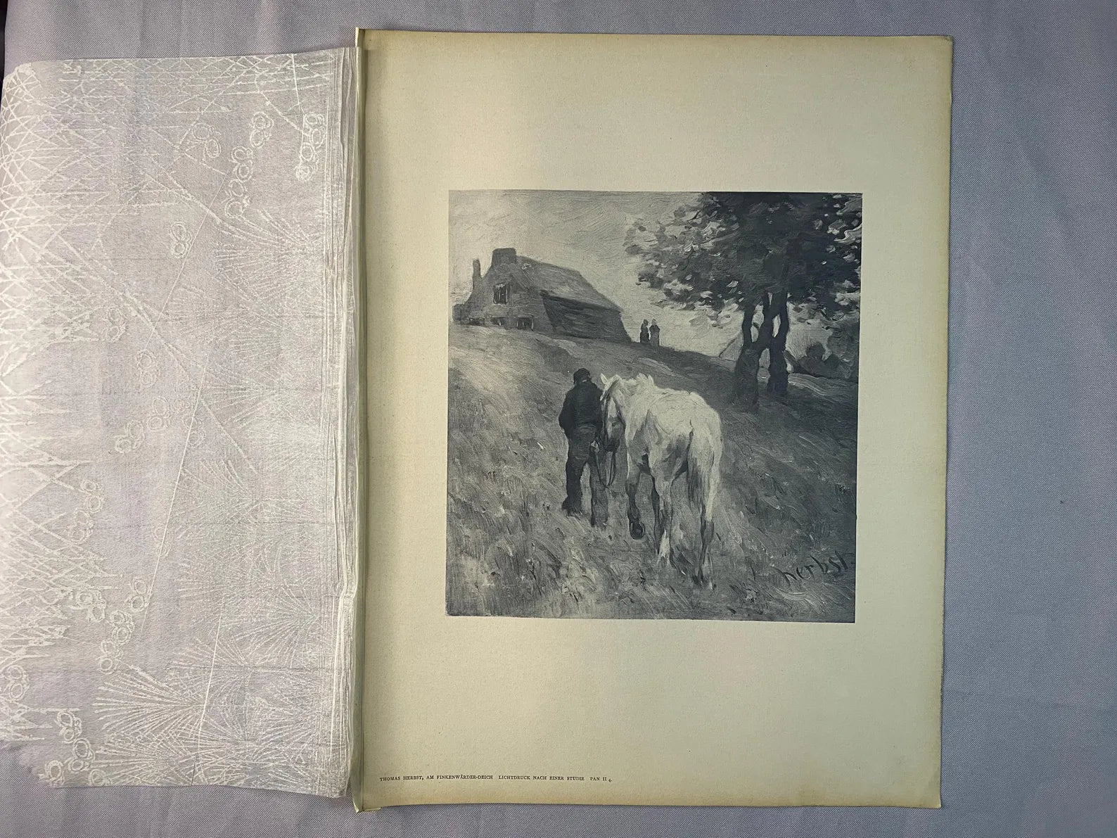 Originaler Lichtdruck nach einem Gemälde von Thomas Herbst (1848–1915), entstanden um 1900. Dargestellt ist ein Bauer, der sein Pferd einen Feldweg entlangführt, im Hintergrund ein Bauernhaus und eine Baumgruppe. Die Szene ist in kräftigen, impressionistisch anmutenden Pinselzügen wiedergegeben und spiegelt die Verwurzelung von Herbsts Kunst in bäuerlichen Alltagsszenen.