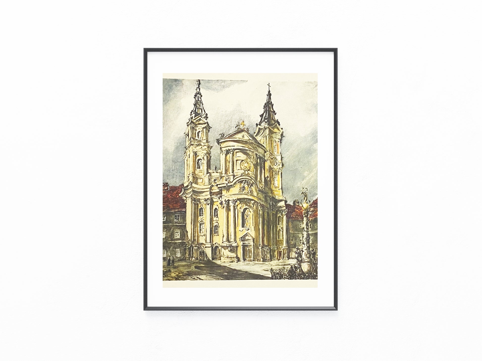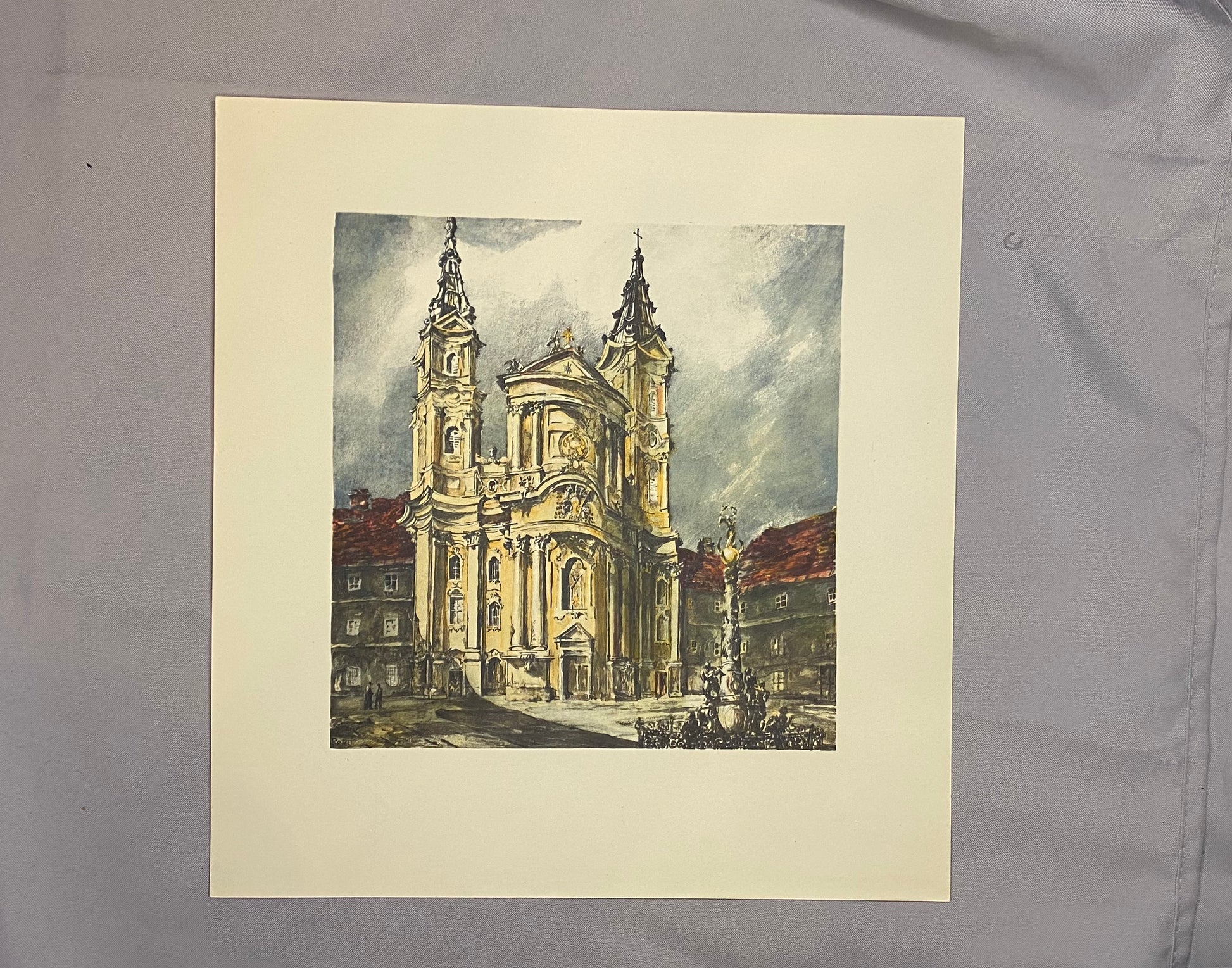 Original Farblithografie von Lily Réthi aus ca. 1930 mit eindrucksvoller Ansicht des Piaristenplatzes in Wien. Im Zentrum erhebt sich die monumentale barocke Piaristenkirche mit ihren beiden markanten Türmen, deren Fassade reich verziert ist. Im Vordergrund ist der Platz mit Brunnen und umliegenden Häusern zu sehen, die dem Motiv eine atmosphärische Tiefe verleihen.