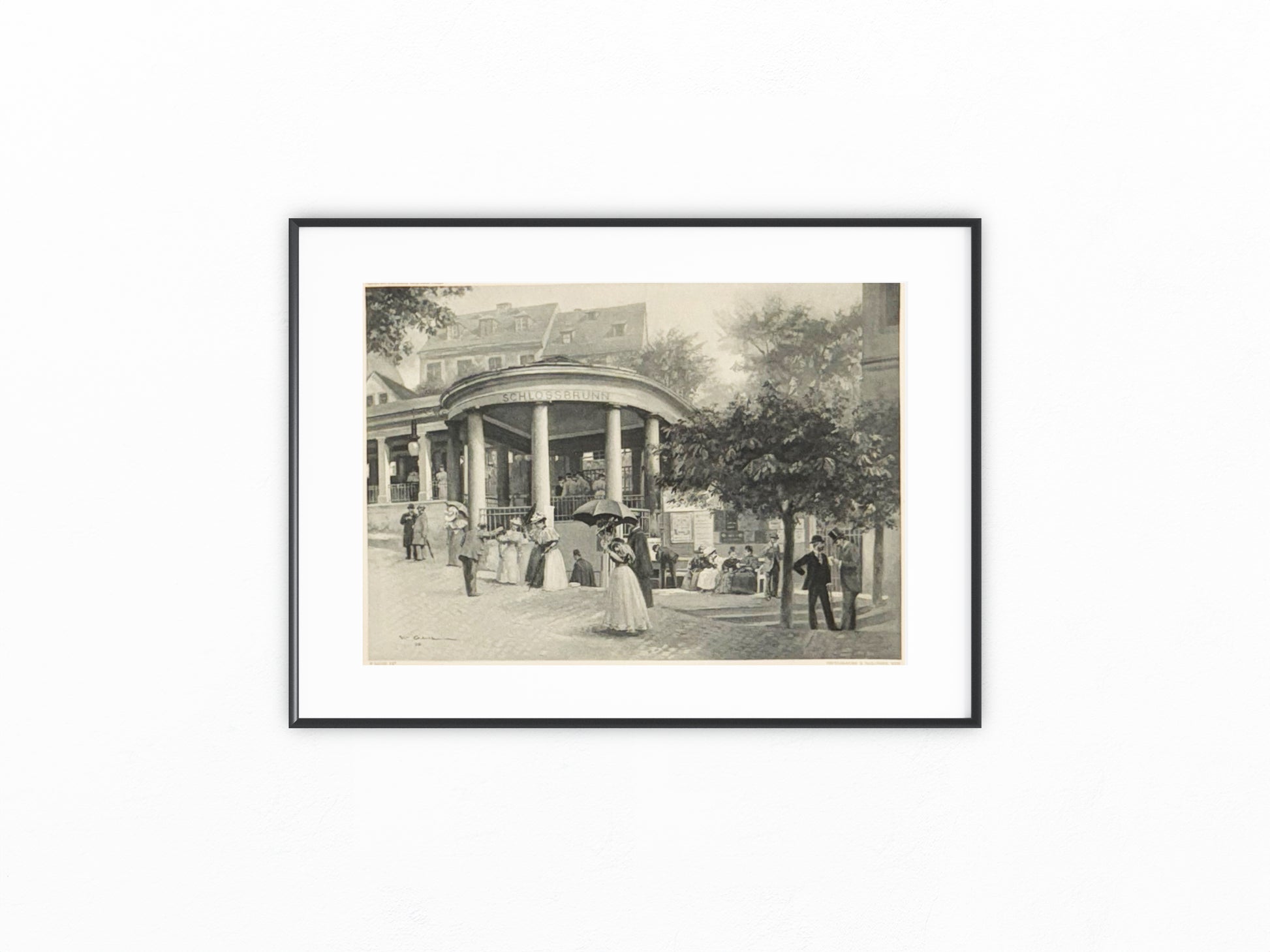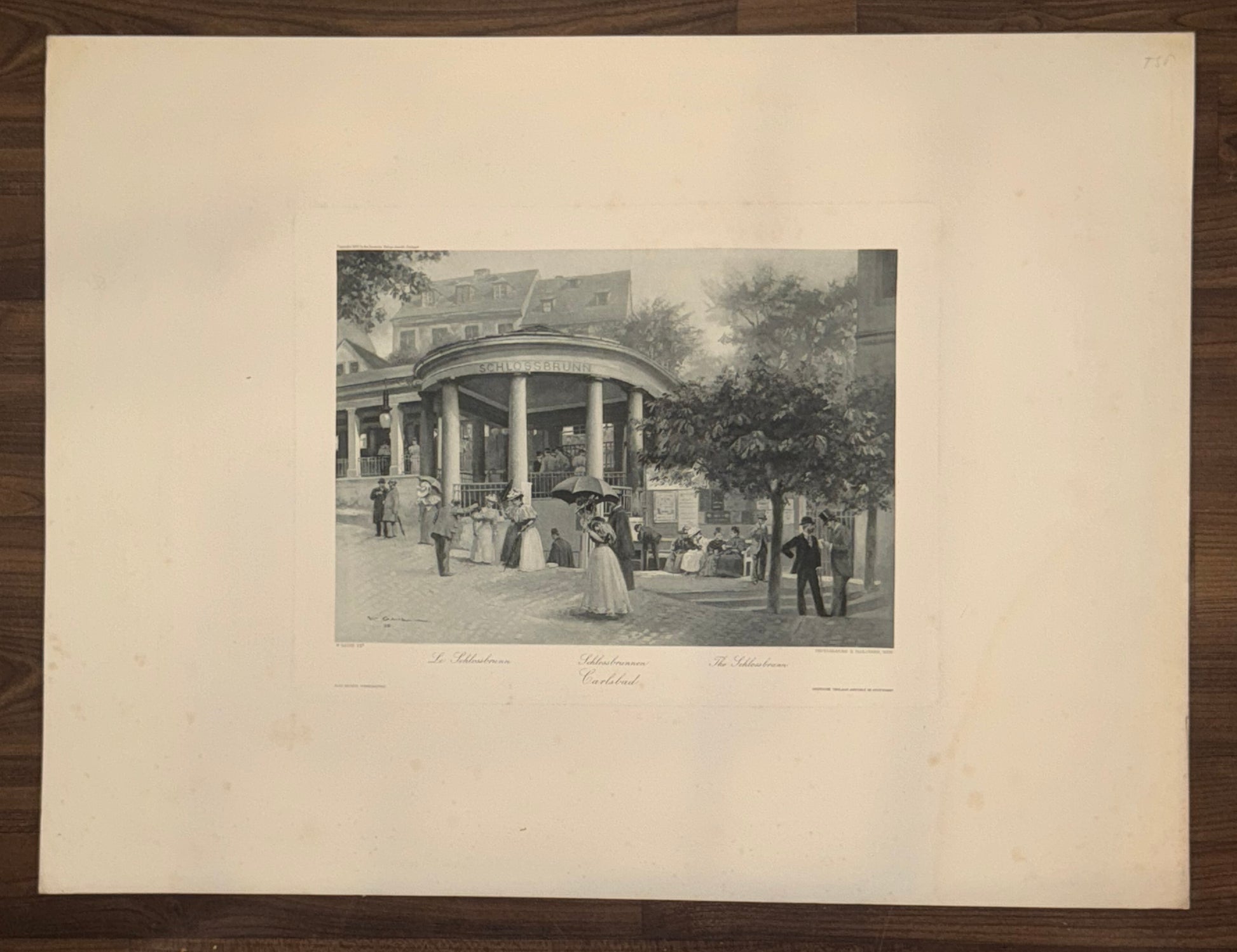 Die Darstellung zeigt den belebten Schlossbrunnen in Karlsbad um 1890, wo elegante Damen und Herren mit Sonnenschirmen und Zylindern vor der Kolonnade flanieren. Im Hintergrund ist die klassizistische Architektur mit den markanten Säulen zu sehen, während Kurgäste das heilkräftige Wasser schöpfen und sich zu Gesprächen im Schatten niederlassen. Diese Grafik vermittelt das mondäne Flair des Kurortes, in dem Gesellschaftsleben, Heilquellen und Architektur eng miteinander verbunden waren.