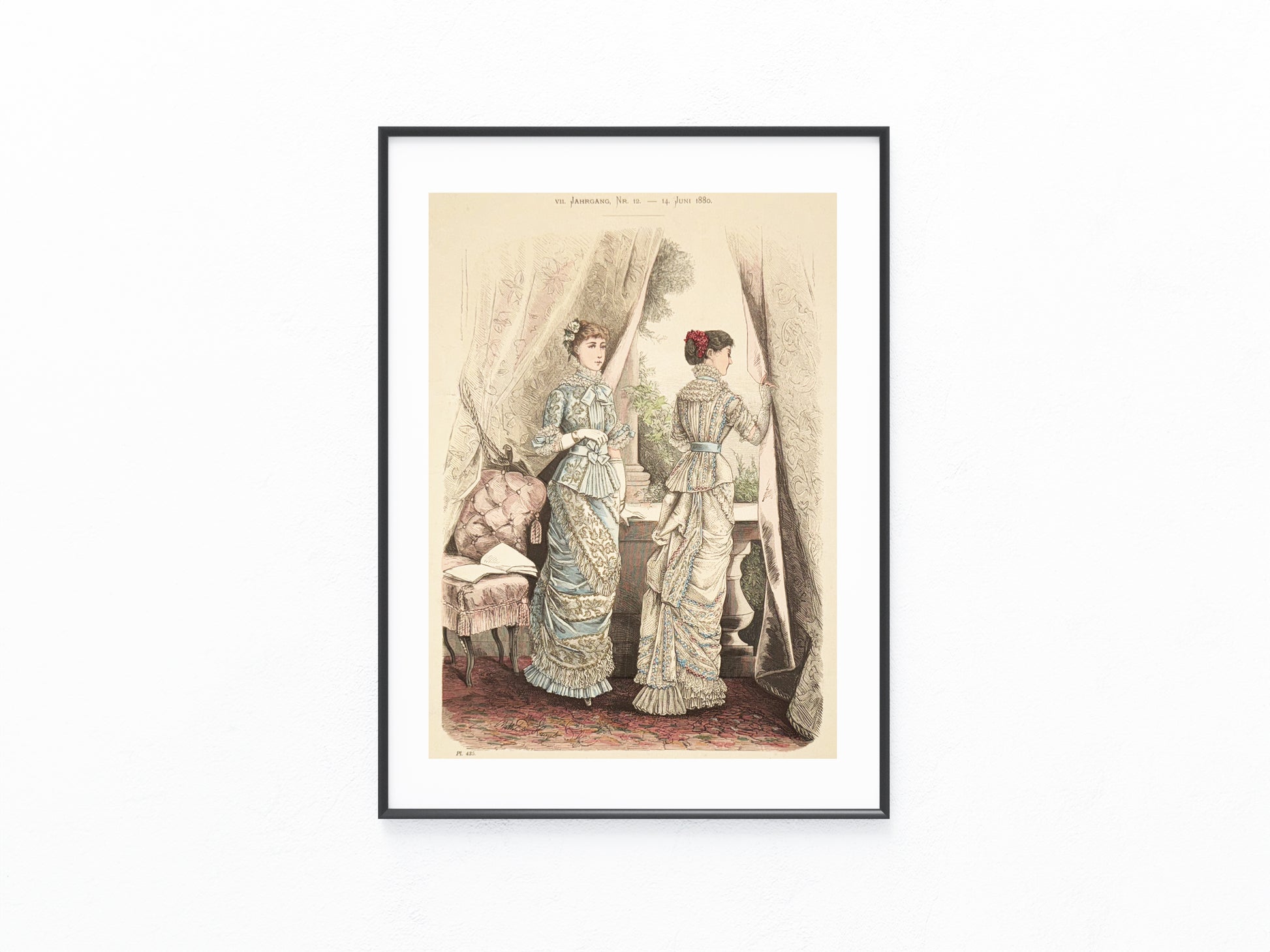 Originale, handkolorierte Modegrafik aus der Illustrierten Frauen-Zeitung, Ausgabe vom 14. Juni 1880. Zwei elegante Damen in aufwendig gearbeiteten Kleidern stehen in einem stilvollen Interieur mit Blick ins Freie. Die linke Dame trägt ein himmelblaues Kleid mit Goldornamenten, die rechte ein fein gemustertes, helles Ensemble mit Schleifen, Spitze und Drapierungen.