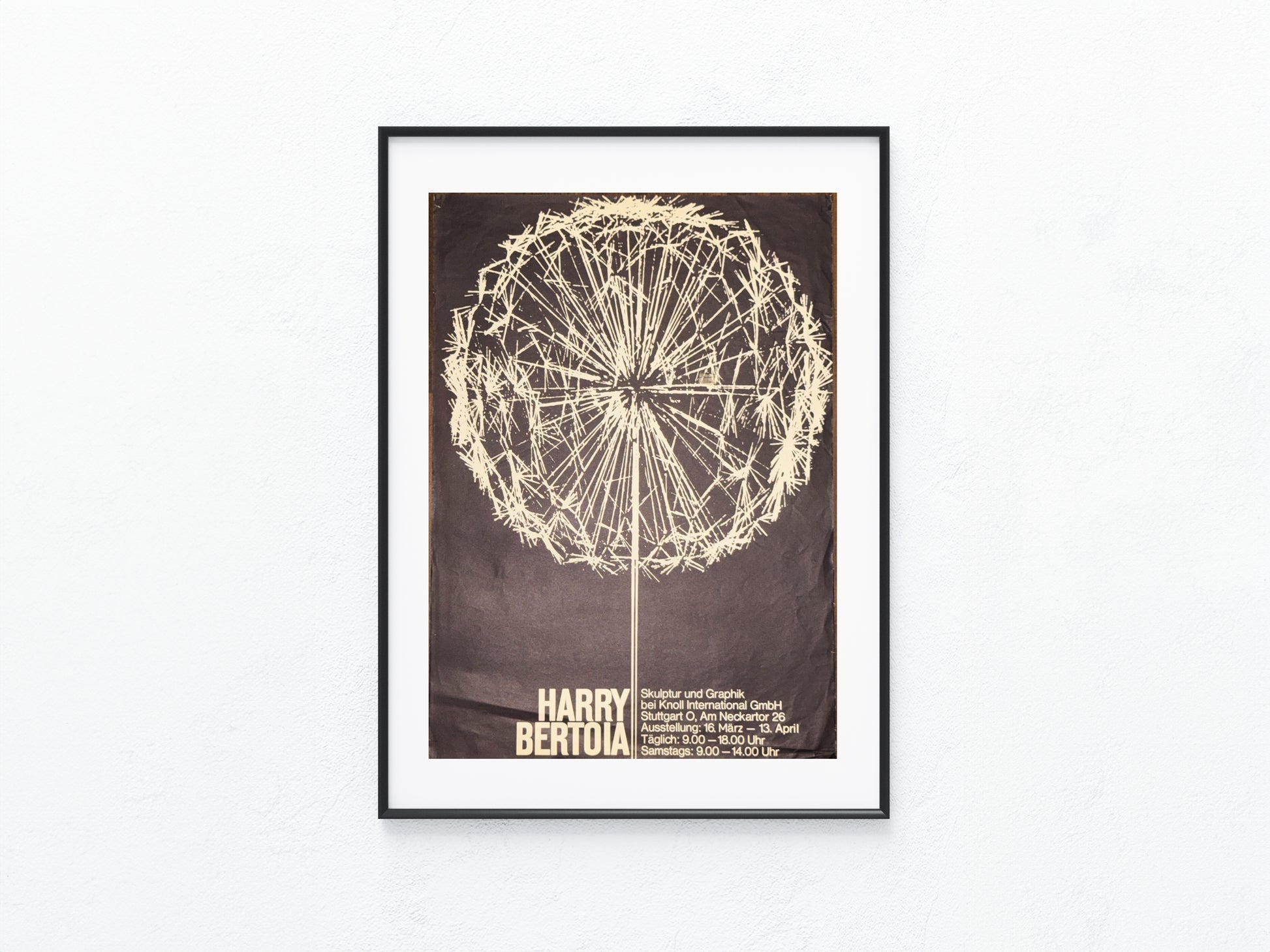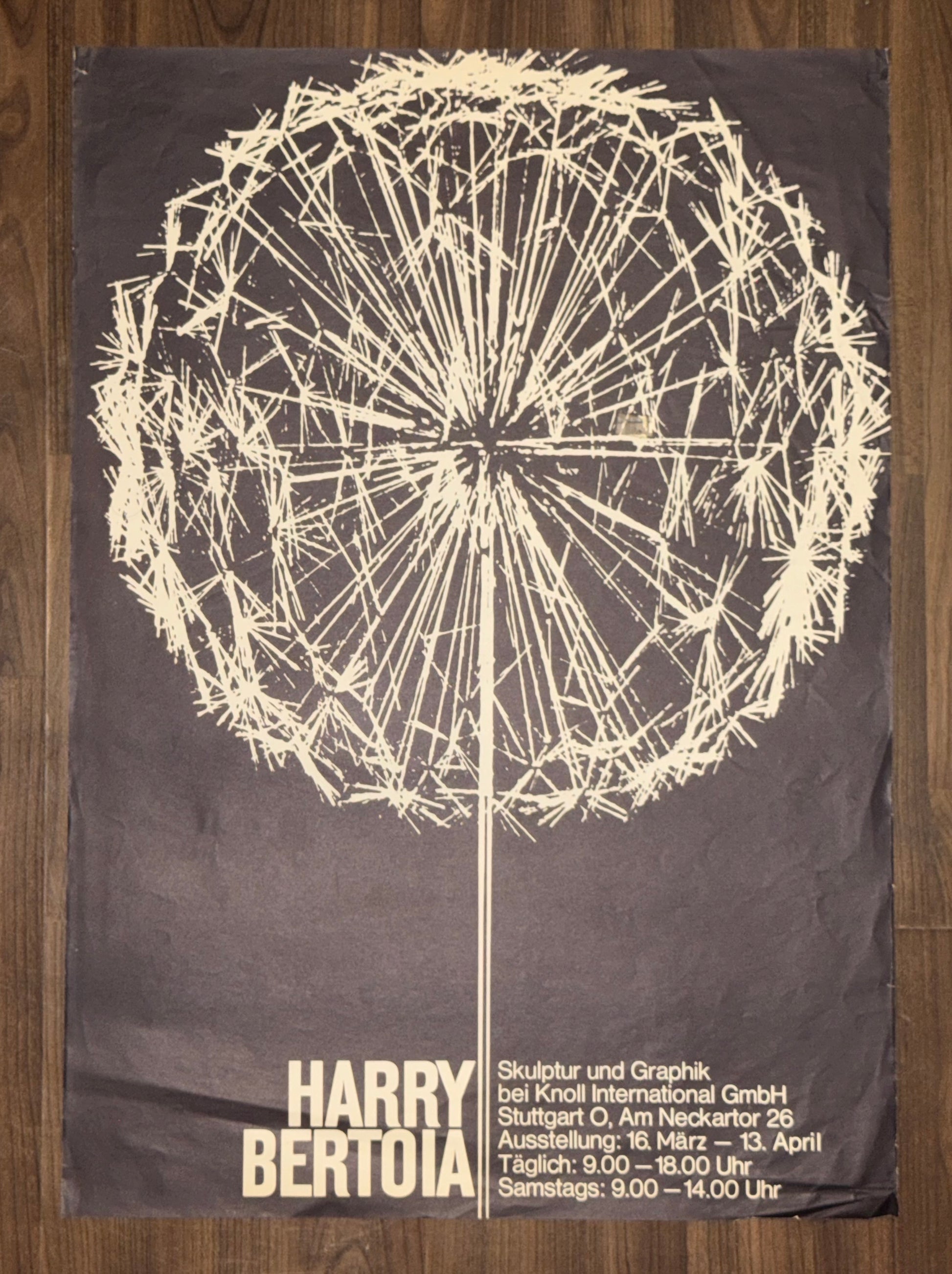 Seltenes Originalplakat zur Ausstellung von Harry Bertoia bei Knoll International in Stuttgart (16. März – 13. April, wohl 1960er Jahre). Das Motiv zeigt die berühmte „Dandelion“-Skulptur, die Bertoia international bekannt machte. Ein eindrucksvolles Zeitdokument aus der Ära des Mid-Century-Designs und ein Highlight für Sammler von Designgrafik und Möbelgeschichte.