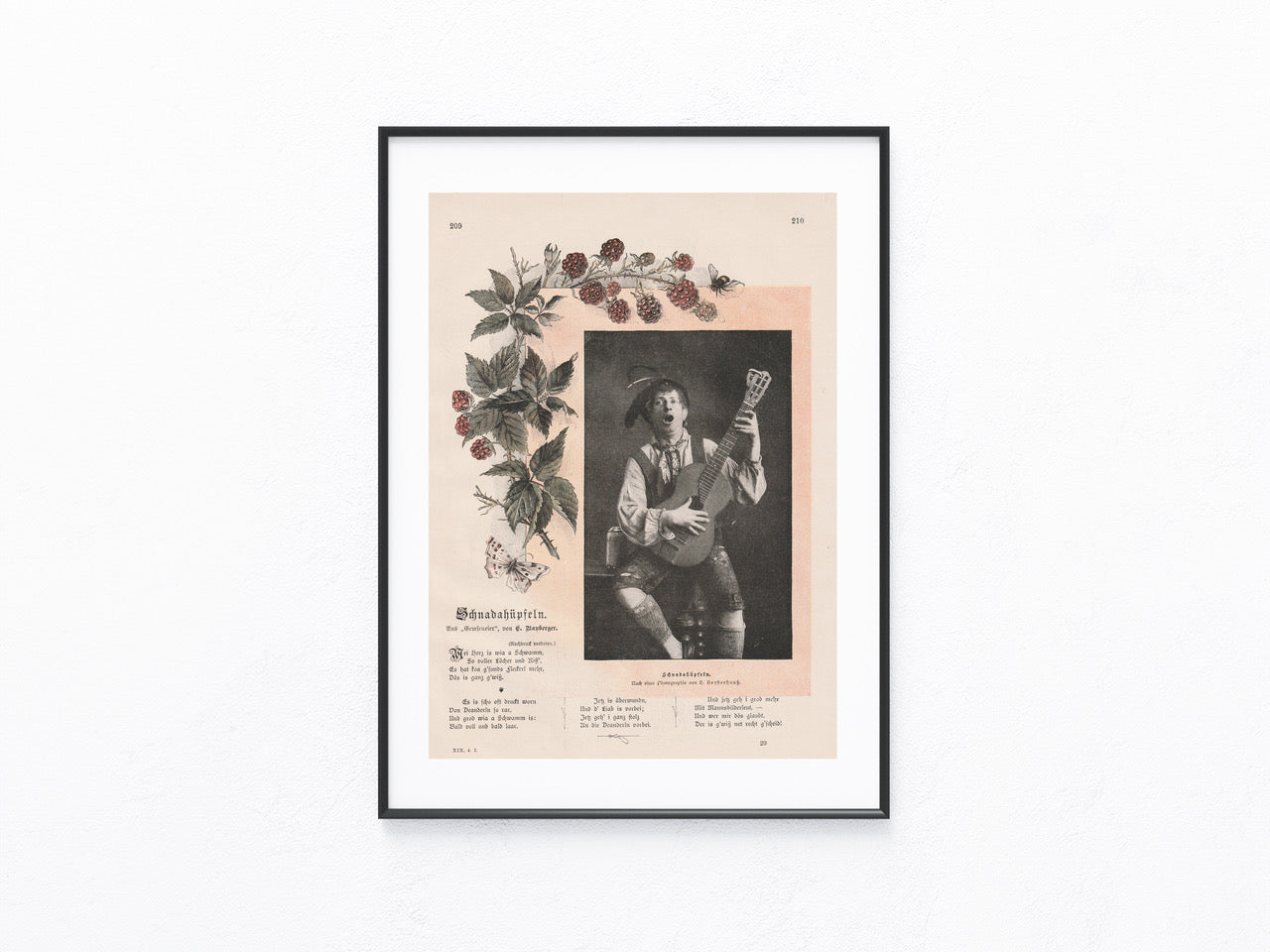 Charmanter Originaldruck um 1890 aus dem Sammelband „Genüsseier“ mit dem Titel „Schnadahüpfln“. Auf der rechten Seite eine humorvolle Szene mit einem bayerischen Musikanten, nach einer Fotografie von S. Herbyshaus, links ein dekorativer Druck mit Brombeerranken, Schmetterling und Gedicht in bayerischer Mundart. Eine seltene Darstellung bayerischer Volkskultur und Liebeslyrik.