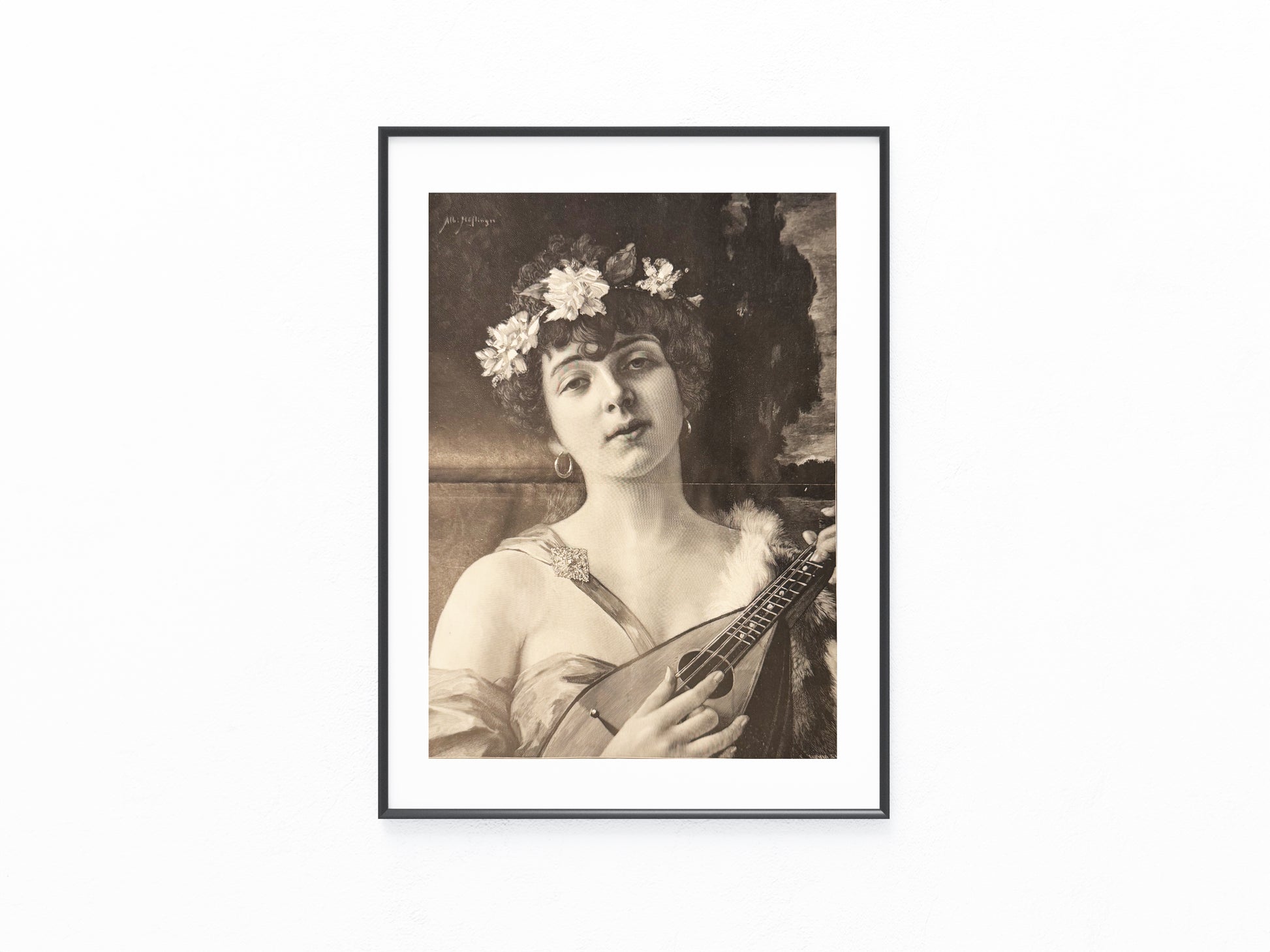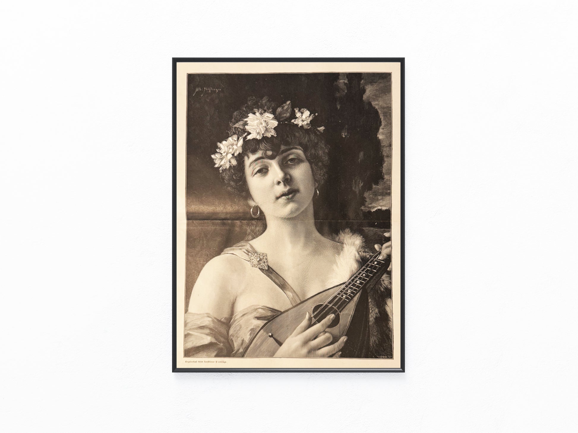 Ausdrucksstarke Darstellung einer jungen Frau mit Mandoline – umgeben von floralen Jugendstil-Elementen und mit zartem Blick, der den Betrachter fesselt. Das Werk stammt von Alb. Höflinger und wurde um 1900 in Berlin veröffentlicht. Der Originaldruck überzeugt durch seine feine Linienführung, den typischen Stil der Zeit und die elegante Komposition zwischen Natur, Musik und Weiblichkeit.