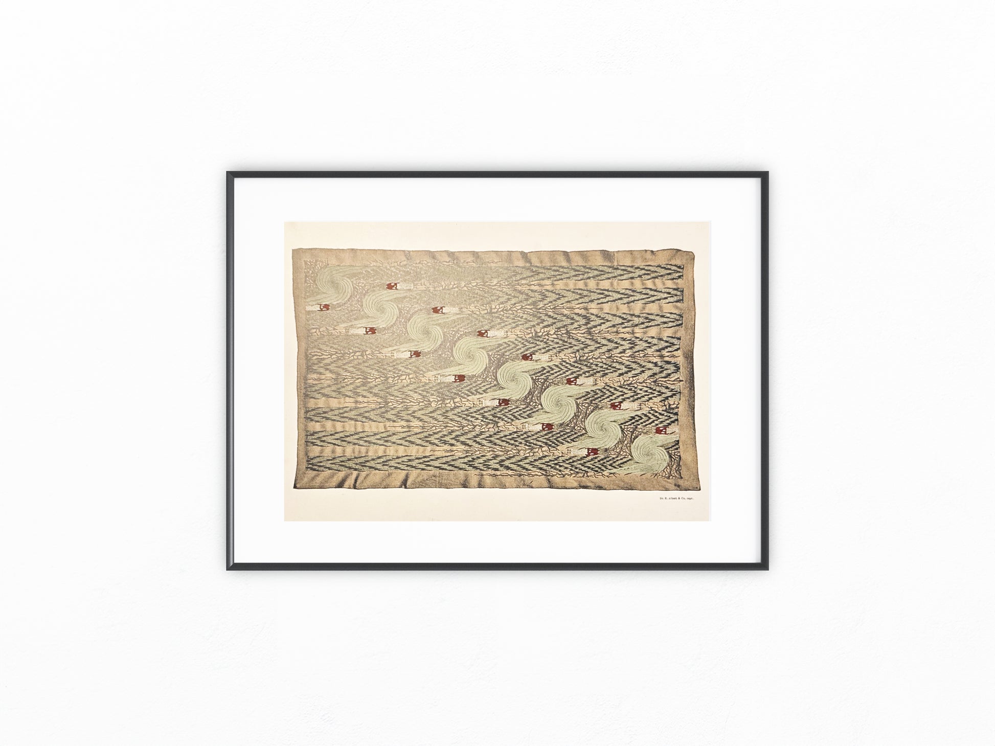 Dekorativer Farbdruck eines geometrisch-abstrakten Stoffmusters im Stil des Wiener Jugendstils. Das Motiv zeigt stilisierte Eulen und grüne Spiralformen auf einem rhythmisch strukturierten Hintergrund. Die feinen Linien und die grafische Wirkung erinnern an Entwürfe der Wiener Werkstätte. Der Druck erschien vermutlich um 1900, möglicherweise im Rahmen einer zeitgenössischen Fachzeitschrift oder Mustersammlung.