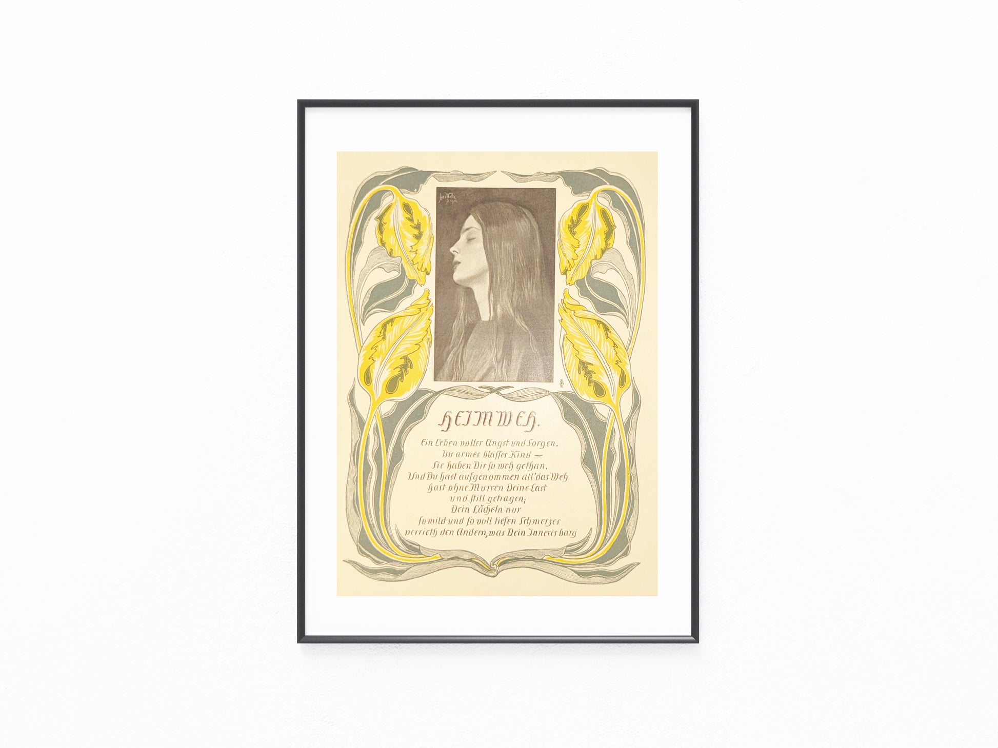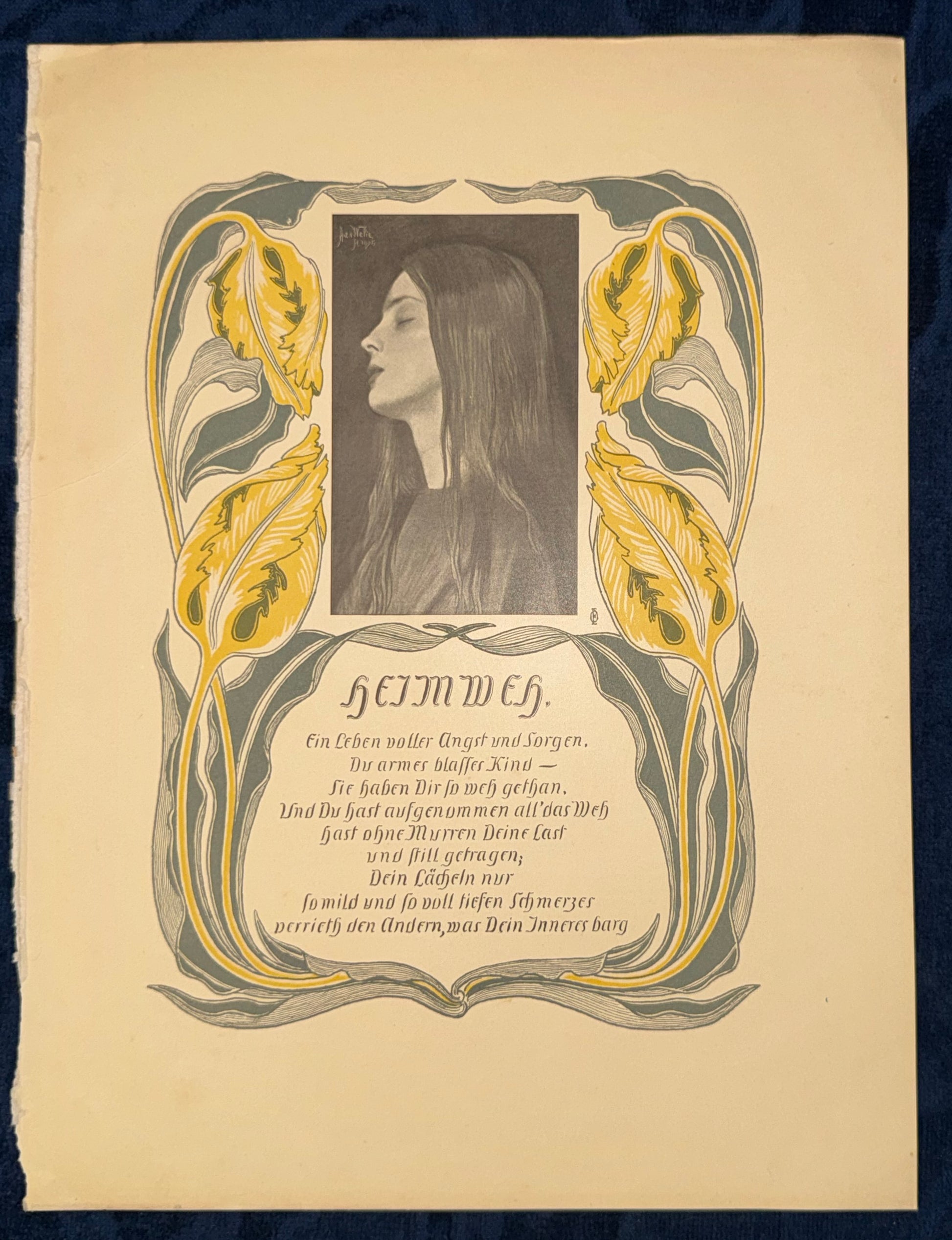 Originaldruck um 1900 mit melancholischem Gedicht und zart kolorierter Jugendstil-Bordüre. Das stilisierte Frauenporträt in der Mitte sowie die floralen Ornamente und die kalligrafisch gesetzte Lyrik sind typisch für den künstlerischen Zeitgeist der Jahrhundertwende. Der Druck stammt vermutlich aus einer illustrierten Zeitschrift der Zeit. Signatur im Bild: J. Wich.