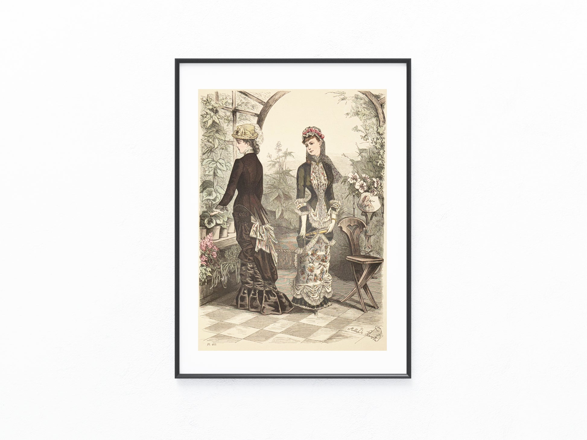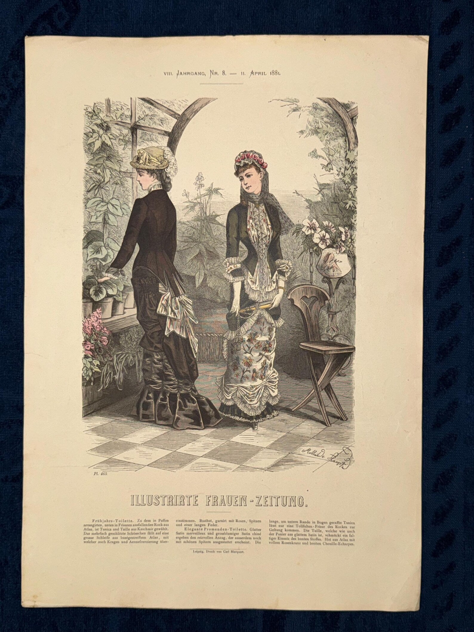 Elegante, handkolorierte Lithografie aus der Illustrierten Frauen-Zeitung, erschienen am 11. April 1881. Dargestellt sind zwei Damen in opulenter Frühjahrsmode in einem lichtdurchfluteten Gewächshaus. Die detailreiche Szene vereint florale Motive, üppige Drapierungen und zeittypische Accessoires wie Hut, Handschuhe und floralen Kopfschmuck.