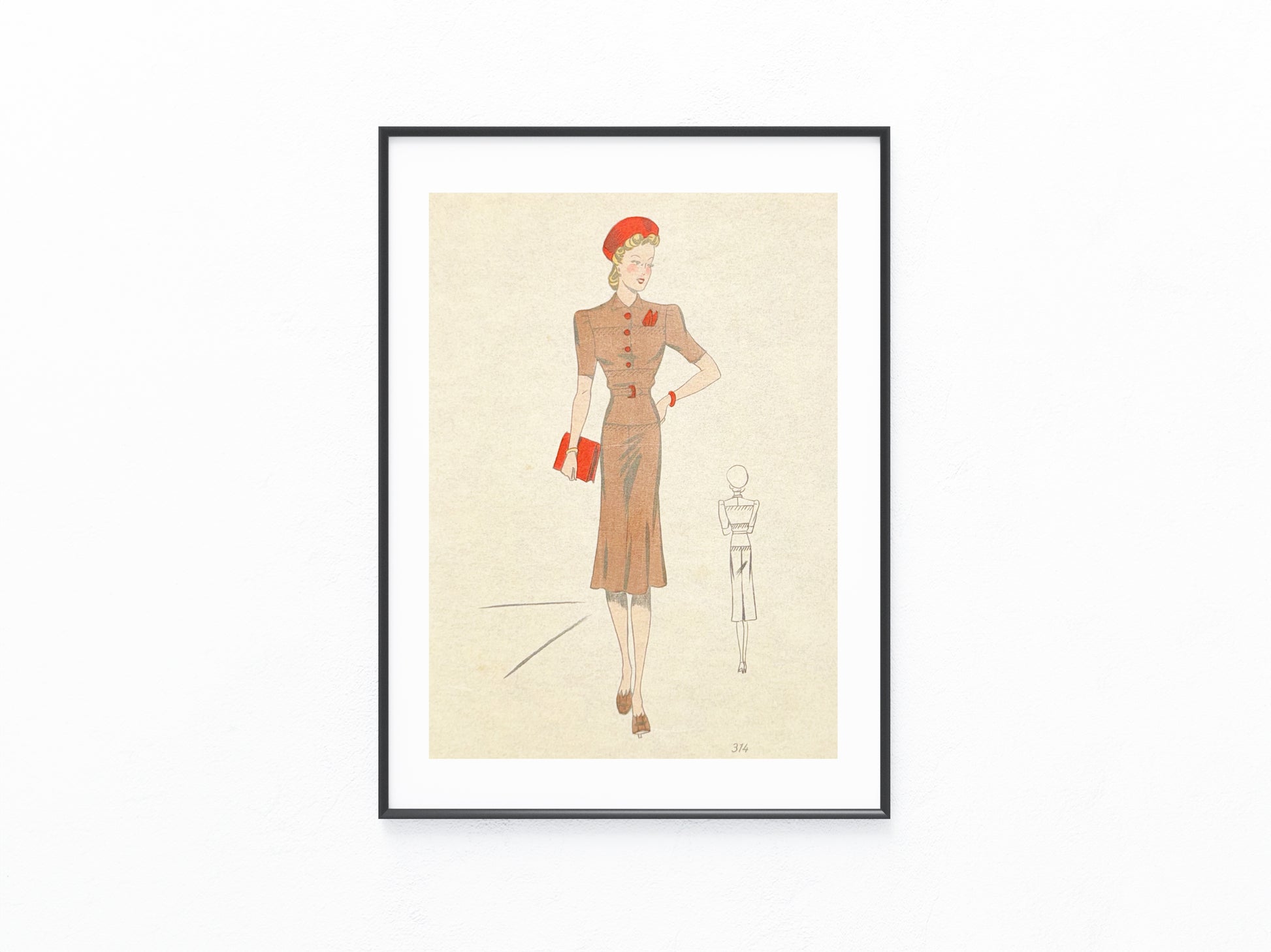 Elegante Modeillustration aus Frankreich mit dem Titel „Robe en tussor“. Die stilvolle Darstellung zeigt eine Frau in einem taillierten Kleid mit roten Accessoires – ein typisches Beispiel für den femininen Chic der 1940er Jahre. Eine zarte Modegrafik mit nostalgischem Flair, perfekt für Liebhaberinnen von Vintage Fashion und nostalgischen Illustrationen.