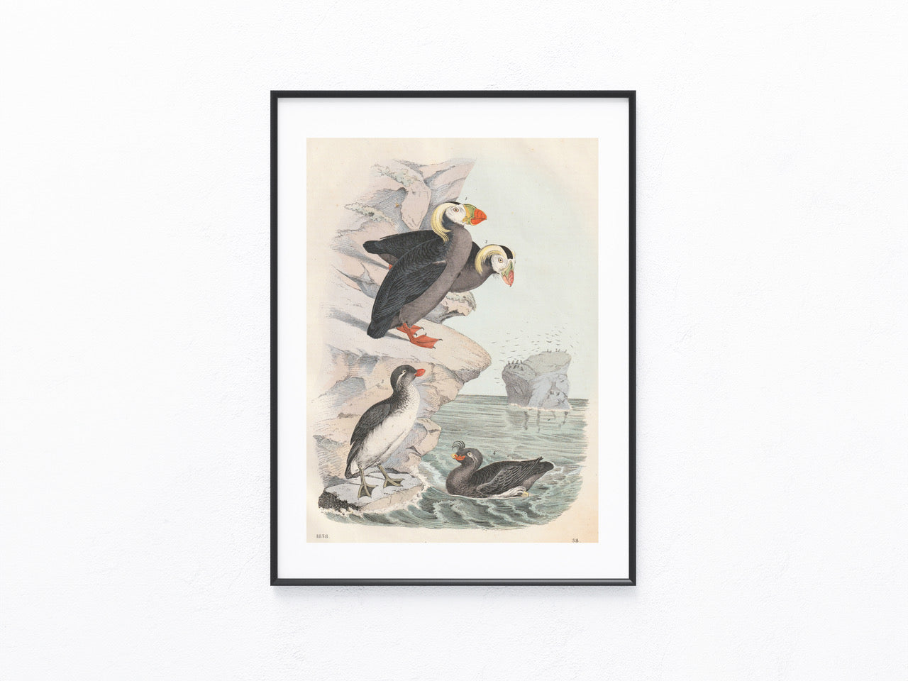 Diese eindrucksvolle Lithografie zeigt vier Meeresvögel an einer Felsküste – eindrucksvoll festgehalten mit leuchtenden Farben und maritimer Atmosphäre.
