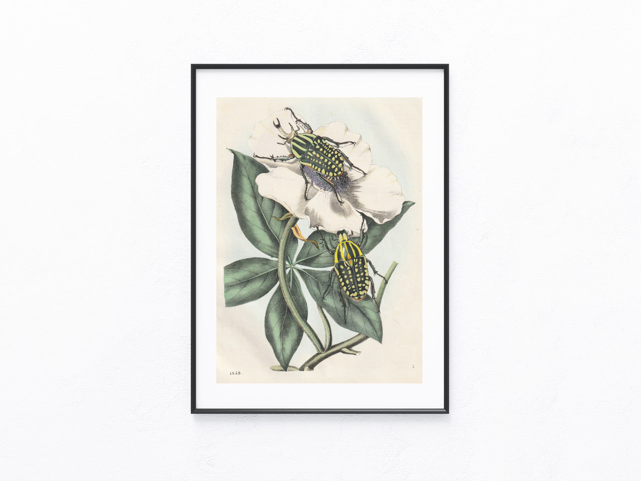 Farbenprächtige Original-Lithografie aus dem Jahr 1858, kein Nachdruck! Zwei leuchtend gezeichnete Rosenkäfer auf einer weißen Blüte – ein echtes Schmuckstück aus der naturkundlichen Illustration.