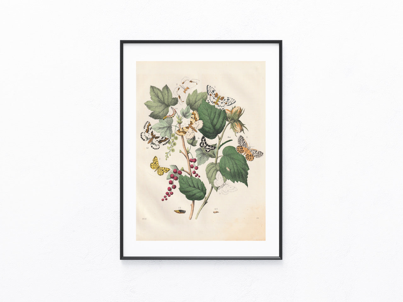 Diese detailreiche Lithografie zeigt eine Vielfalt an Schmetterlingen, Raupen und Puppen auf Beeren- und Laubpflanzen – lehrreich und dekorativ zugleich.