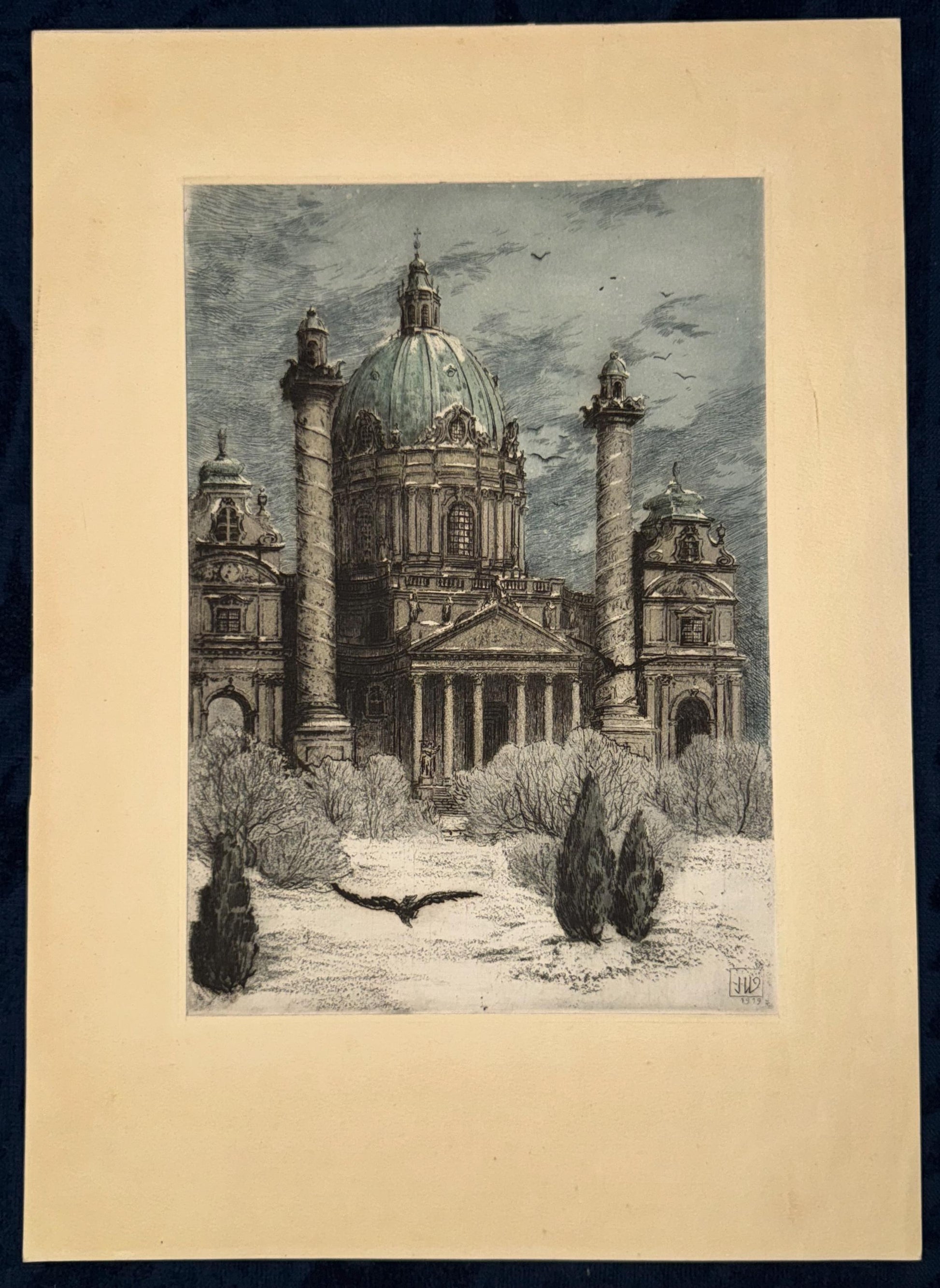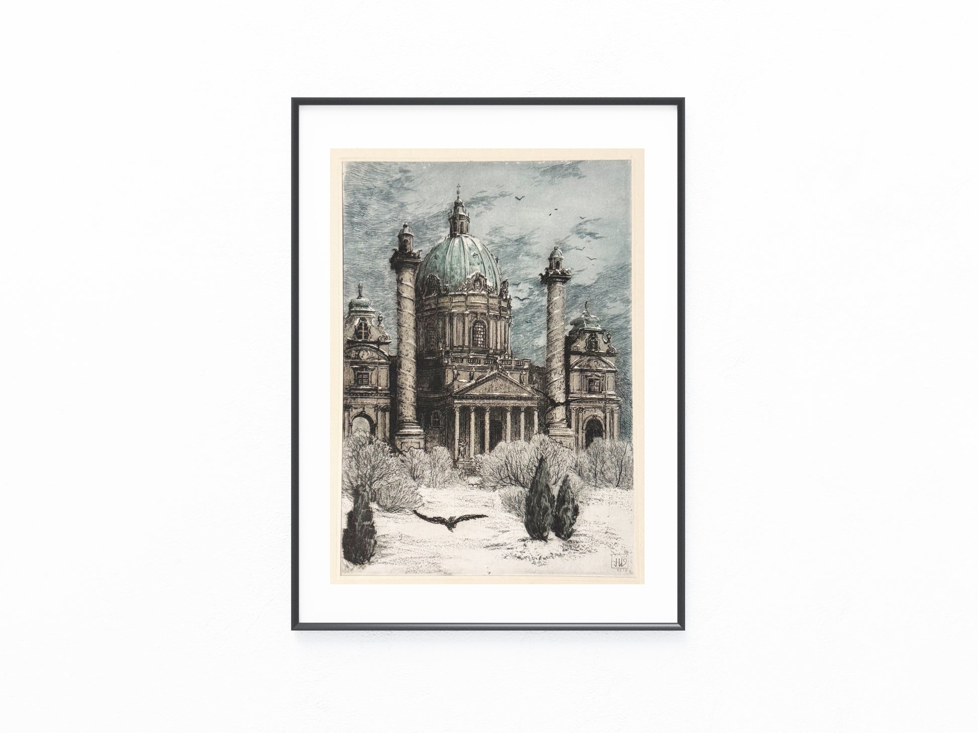 Stimmungsvolle Original-Radierung der Wiener Karlskirche im Winter, datiert mit 1919. Die markante Kuppel, flankiert von den berühmten Säulen, hebt sich eindrucksvoll vom dramatisch bewölkten Himmel ab. Der schneebedeckte Vorplatz mit kahlen Büschen und fliegendem Vogel verstärkt die melancholische Winterstimmung. Die detailreiche Darstellung kombiniert klassische Architektur mit malerischer Atmosphäre.