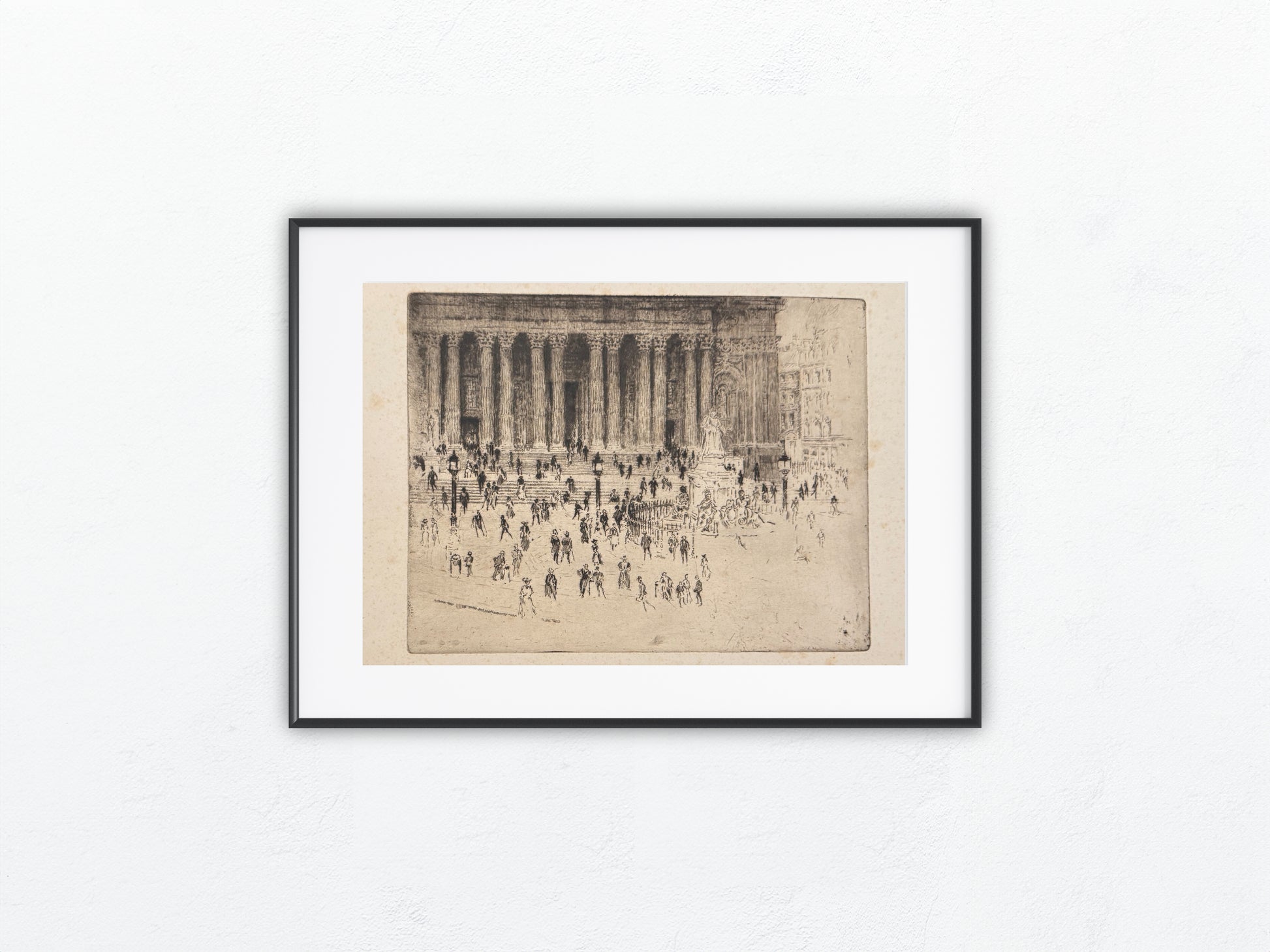 Fein ausgearbeitete Ansicht Londons um 1880 von Joseph Pennell. Die detailreiche Radierung zeigt das belebte Treiben vor der prächtigen Fassade der Royal Exchange. Im Vordergrund strömen zahlreiche Fußgänger über den Platz, während Kutschen und Straßenlaternen das lebendige Stadtbild ergänzen. Die klare Linienführung und der typische Stil Pennells verleihen der Szene eine eindrucksvolle Tiefe und Authentizität.