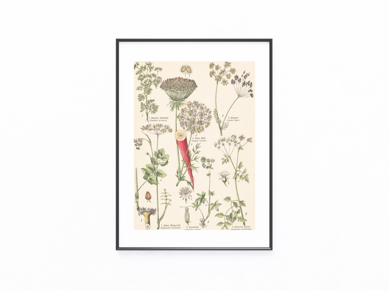 Diese farbige Darstellung zeigt heimische Doldenblütler in botanischer Präzision: