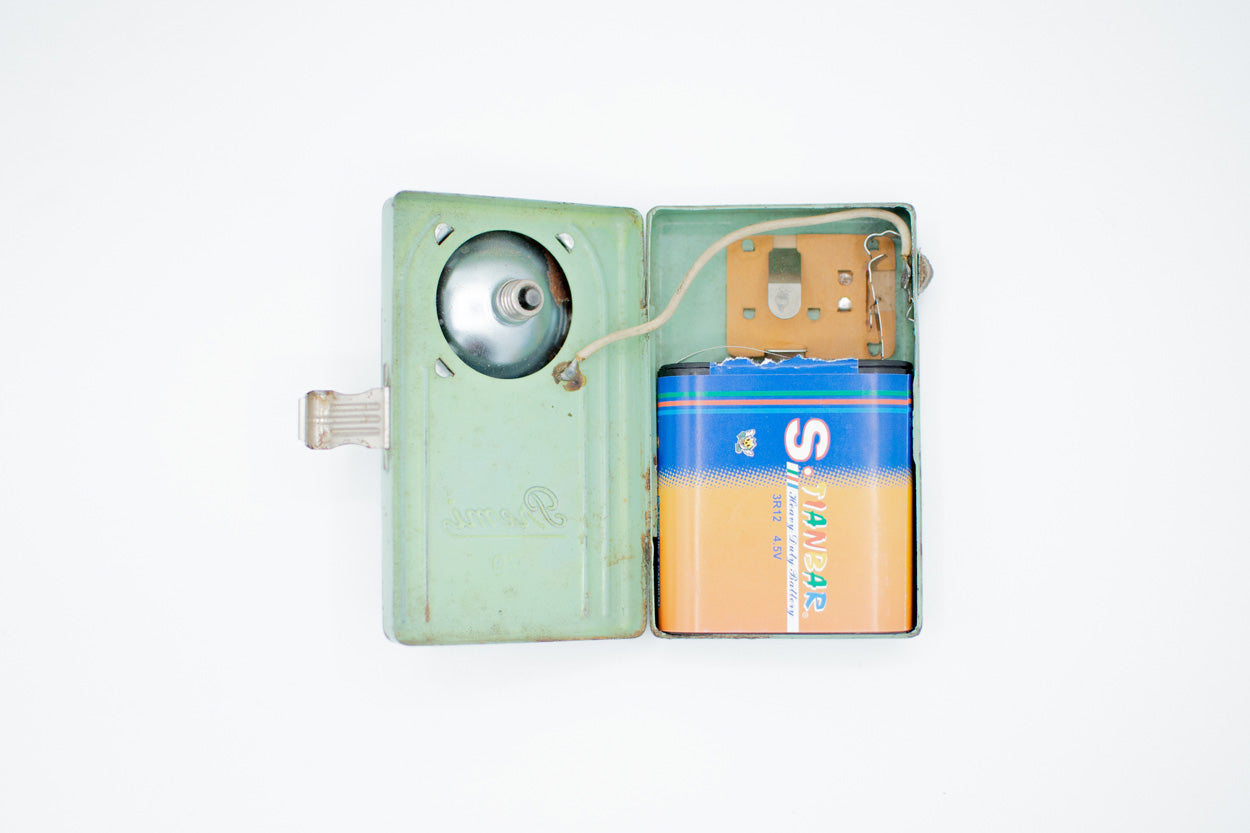 Die Original Premi 79 Signal Taschenlampe ist ein authentisches Stück aus der österreichischen Nachkriegszeit. Diese robuste und zuverlässige Taschenlampe ist in einem ansprechenden Türkiston mit einer charakteristischen Patina gehalten, die Zeugnis ihrer langen Lebensdauer und ihres Vintage-Charmes ablegt. Sie ist inklusive Glühbirne und Batterie voll funktionsfähig. Ein praktischer Haken zum Aufhängen macht sie zu einem vielseitigen und handlichen Begleiter für verschiedene Gelegenheiten. Diese Taschenlampe ist nicht nur ein funktionales Werkzeug, sondern auch ein Stück Geschichte, das in jeder Sammlung von Nachkriegsobjekten oder als dekoratives Element einen besonderen Platz einnimmt.