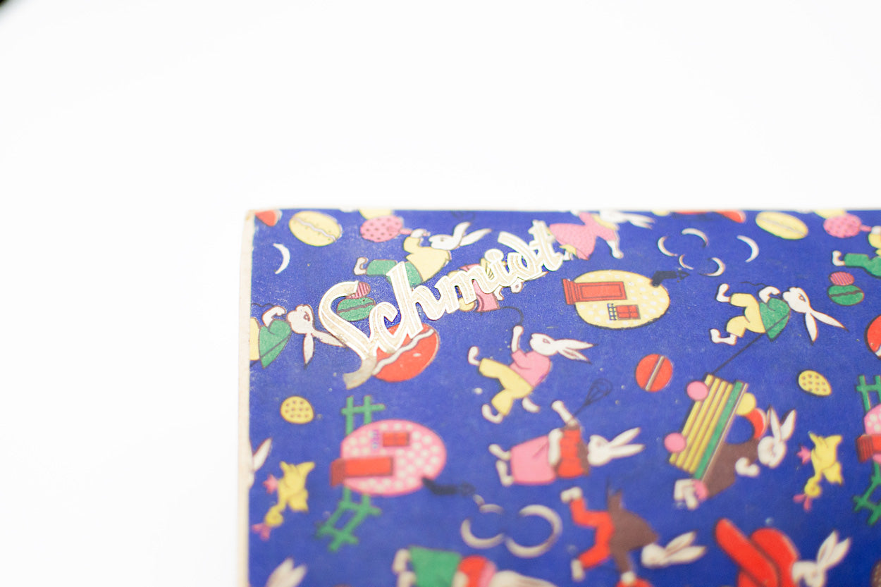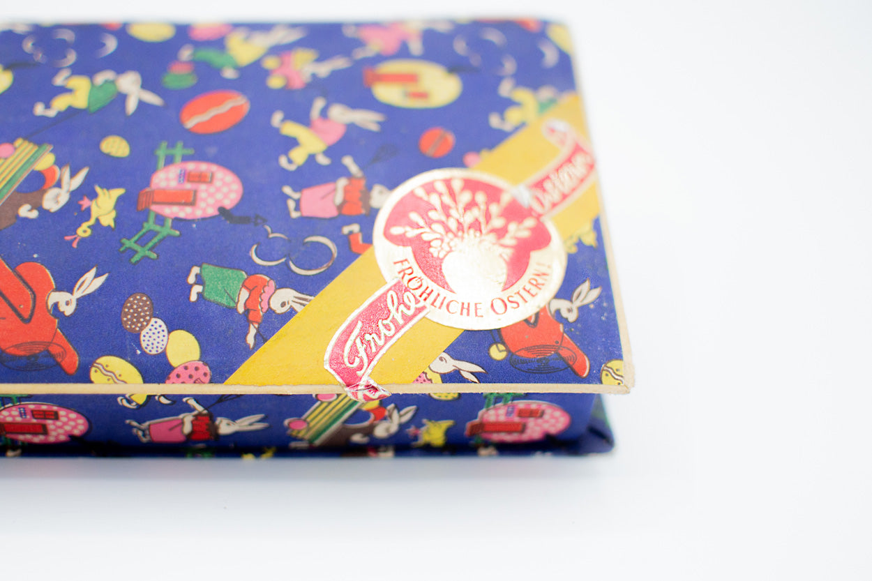 Eine originale Retro-Schatulle von Victor Schmidt & Söhne mit dem Motiv „Frohe Ostern / Fröhliche Ostern“. Die Schatulle, verziert mit Osterhasen und Ostereiern, ist ein charmantes Beispiel österreichischer Handwerkskunst aus den 1960er Jahren. Gefertigt aus robustem Karton, verfügt sie über einen abnehmbaren Deckel. Auf der Unterseite findet sich der Schriftzug „Made in Austria by Victor Schmidt & Söhne Vienna“, der ihre Authentizität und Herkunft bestätigt. Trotz leichter Altersspuren wie stellenweisem Abrieb, bleibt sie ein attraktives Sammlerstück und ein Zeugnis der vergangenen Ostertraditionen.