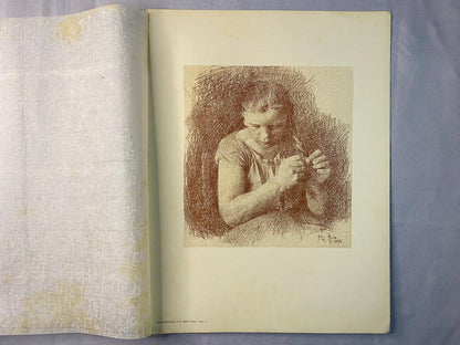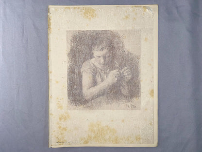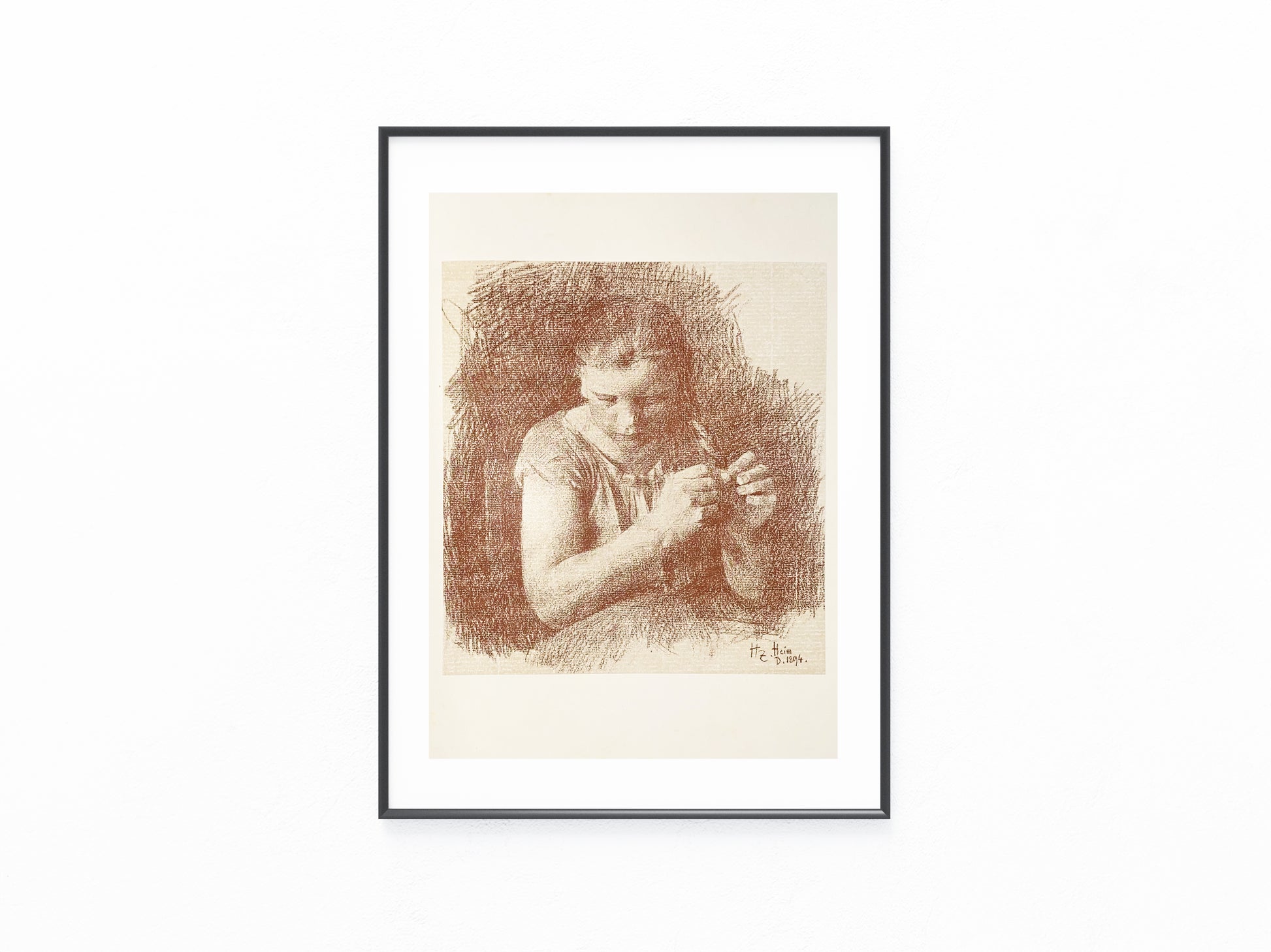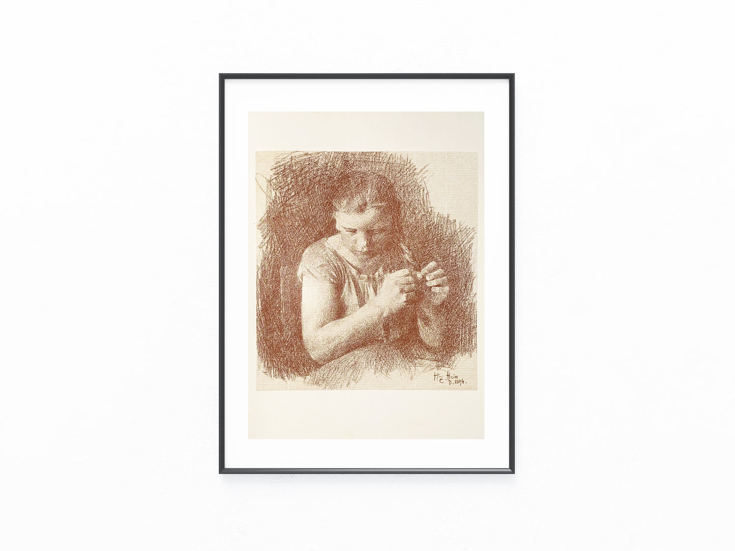 Originaldruck nach einer Rötelzeichnung von Heinz Heim erschienen in der Kunstzeitschrift PAN. Die intime Szene zeigt eine Frau, die konzentriert an ihrer Handarbeit arbeitet – ruhig, nahbar und sehr fein in Tonwerten und Schraffuren ausgearbeitet.