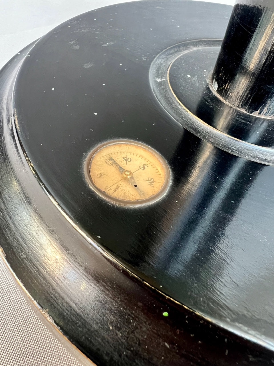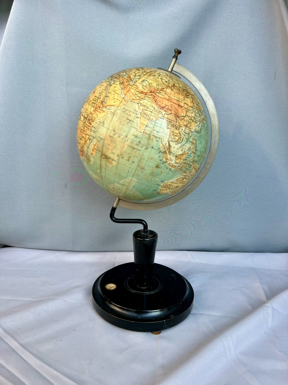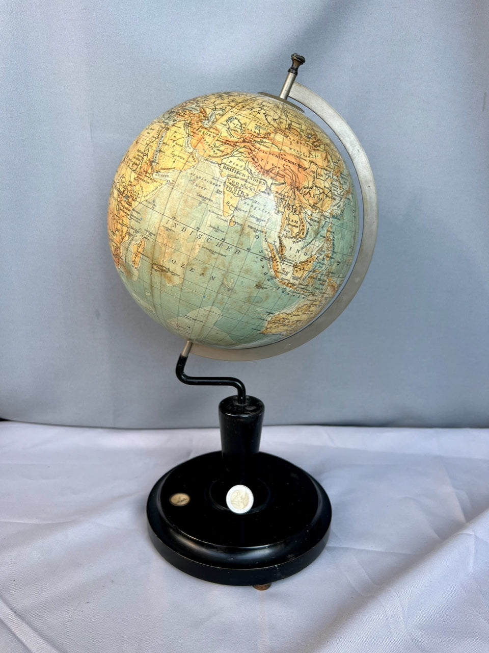 Mit funktionsfähigem Kompass im Holz-Sockel, Halbmeridianring aus Metall, stellenweise leicht berieben, lithografierte u. kolorierte Papiersegmente (diese etwas fleckig/angeschmutzt), ein ordentliches bis gutes Exemplar