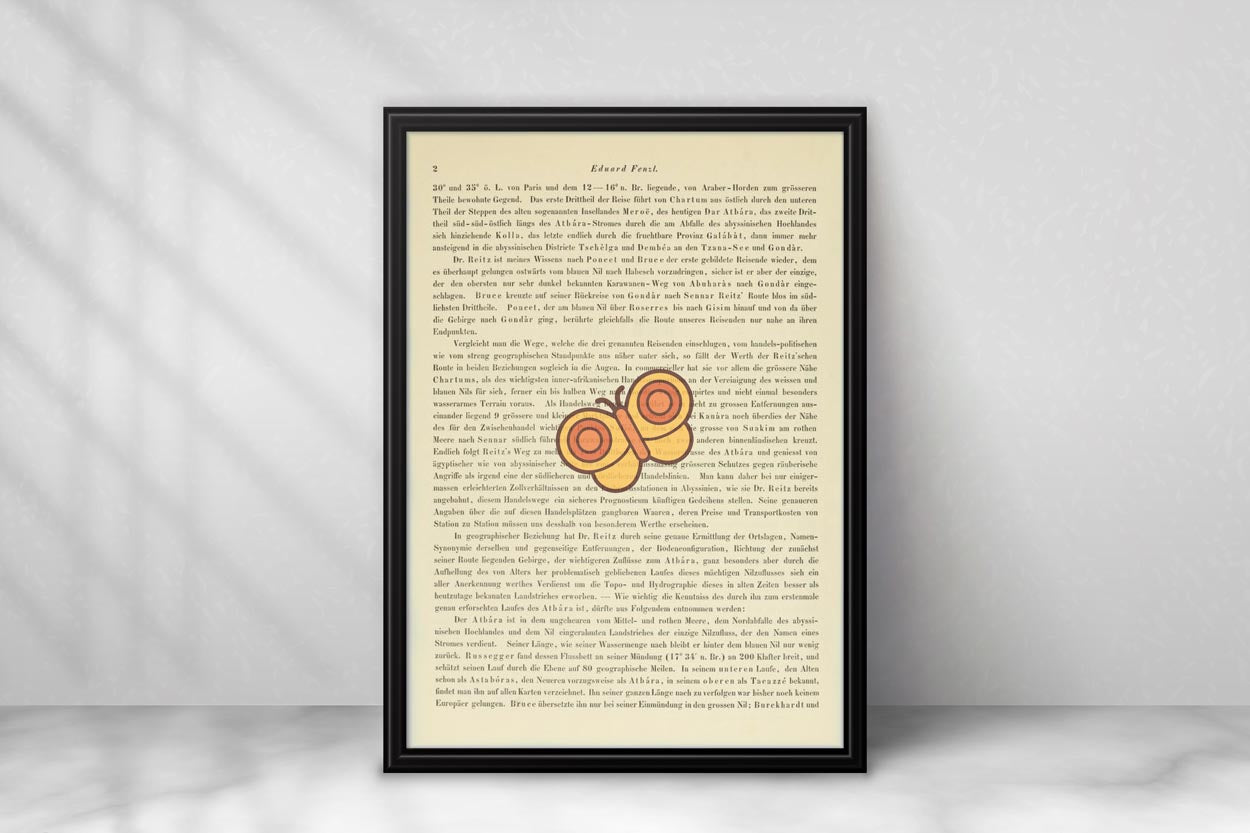 Unsere Drucke sind auf Seiten der Denkschriften der Akademie der Wissenschaften in Wien gefertigt, die über die Jahre eine wunderschöne elfenbeinfarbene Patina entwickelt haben. Mit einem Alter von mindestens 100 Jahren hat jede Seite ihren eigenen einzigartigen Charakter. Jeder Druck erfolgt direkt auf die einzelne Buchseite, sodass kein anderer das gleiche Stück wie du besitzen wird – ein echtes Unikat eben.