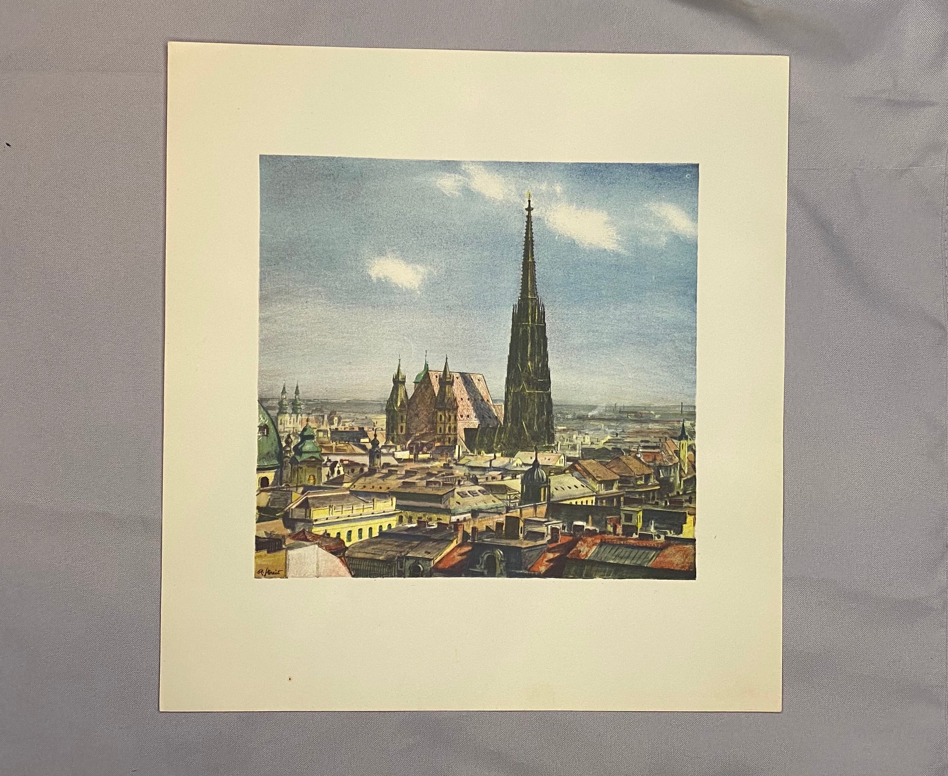 Original Farblithografie aus ca. 1930 mit eindrucksvollem Blick über die Dächer Wiens auf den Stephansdom. Der markante Südturm ragt über die Altstadt hinaus und prägt die Silhouette der Stadt. Die detailreiche Ansicht vermittelt den historischen Charme Wiens in der Zwischenkriegszeit.