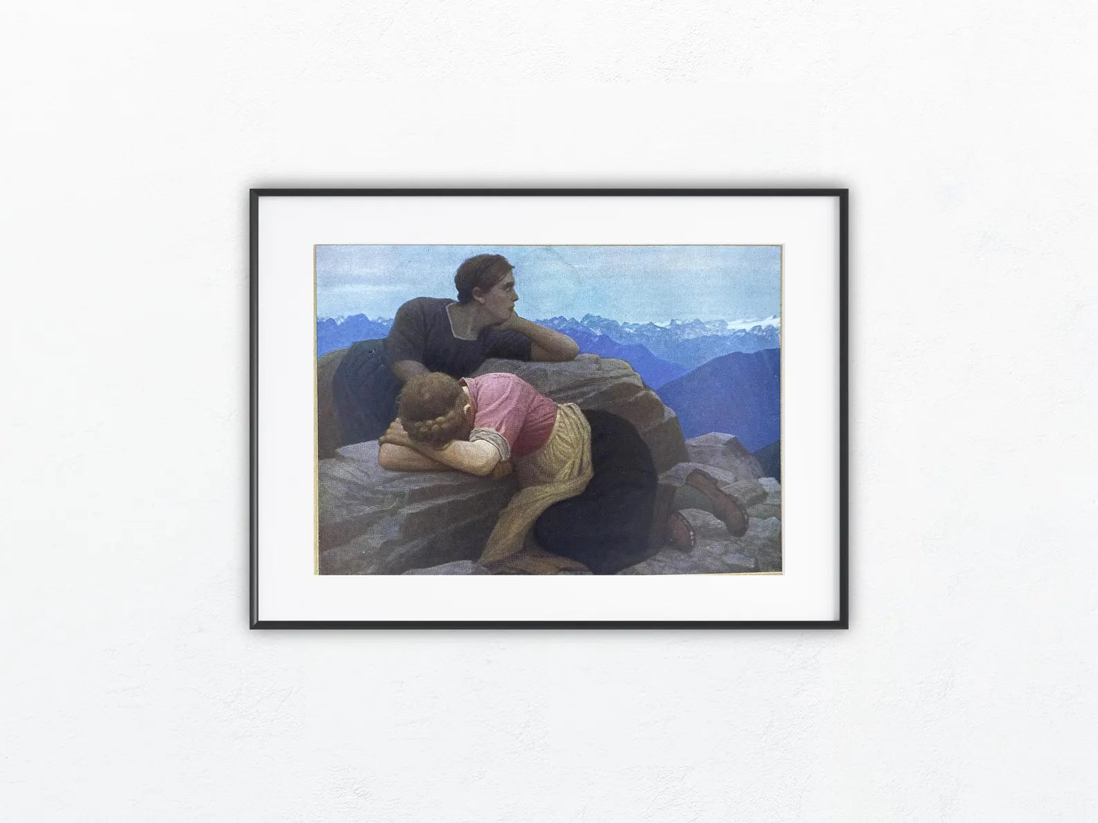 Stimmungsvolle Farblithografie Verlorene Heimat, entstanden um 1900. Das Blatt zeigt zwei Frauen in Tracht auf einem Felsen mit Blick auf die majestätischen Alpen. Die Szene vermittelt eine ergreifende Stimmung von Abschied, Verlust und Sehnsucht. Unten mittig betitelt Verlorene Heimat. Die Grafik ist auf festen Karton aufgezogen.