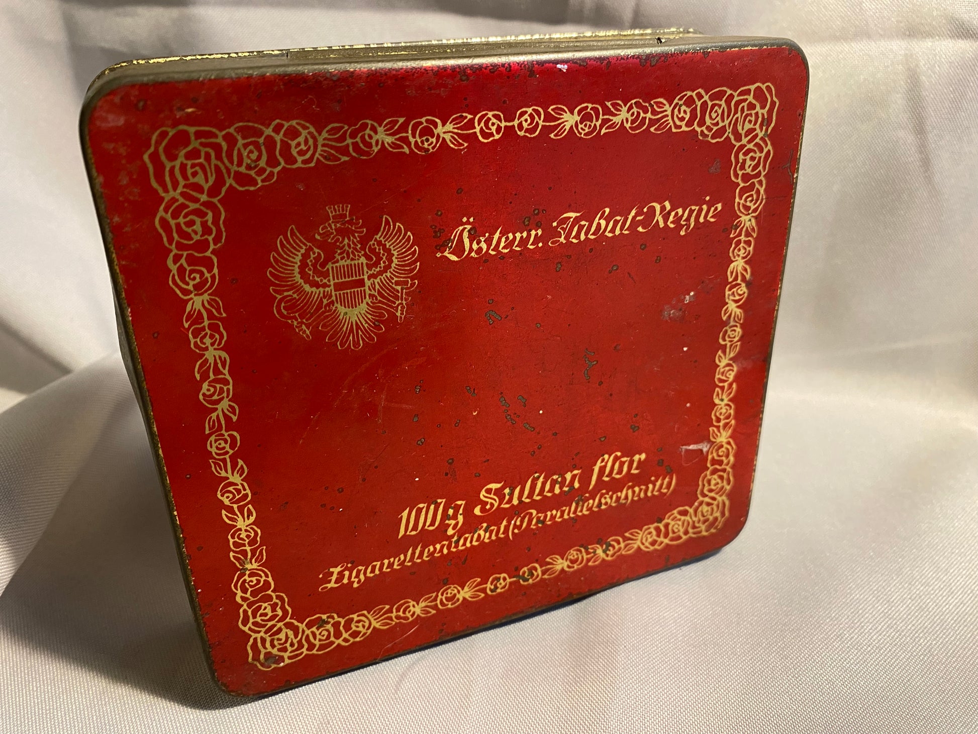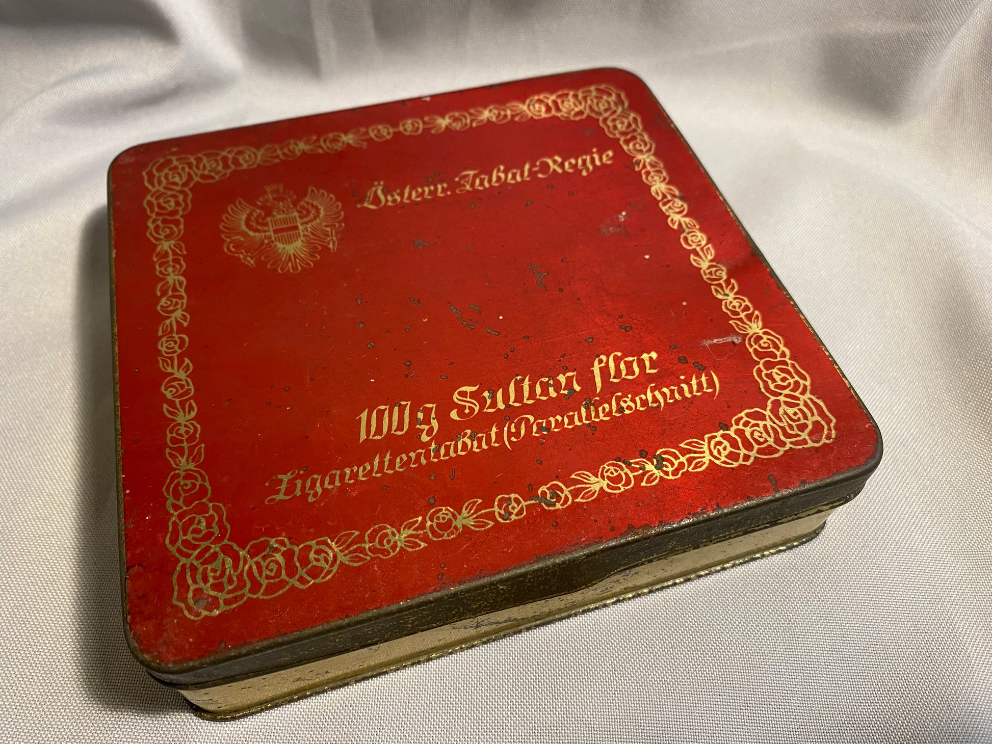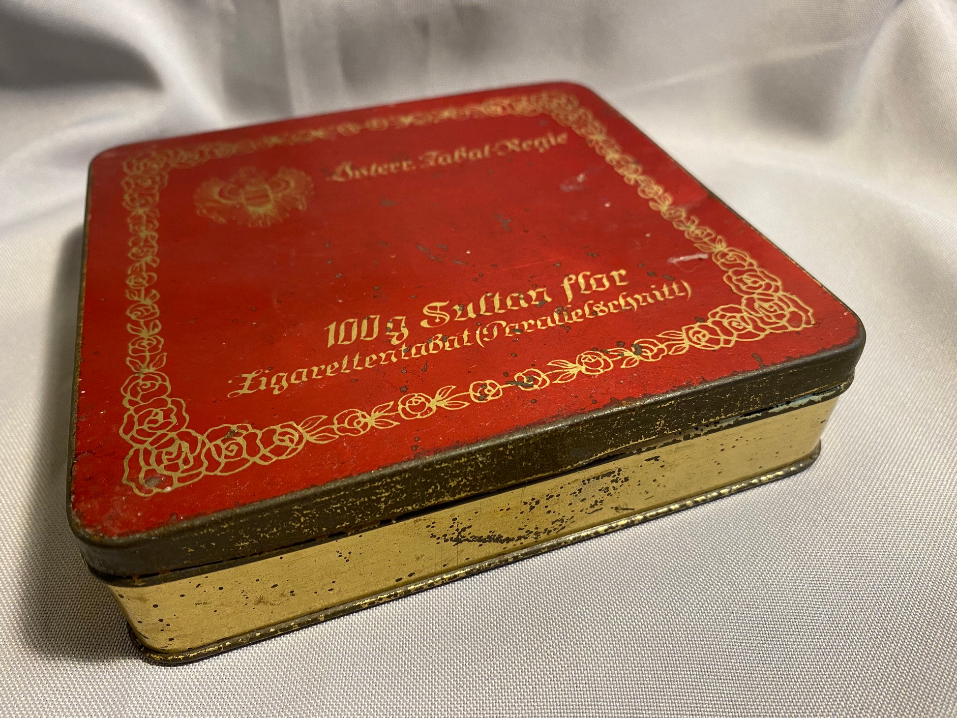 Tauchen Sie ein in die Ära des frühen 20. Jahrhunderts mit dieser originalen Tabakdose der Österreichischen Tabak-Regie. Vorgesehen für 100g Sultan flor Zigarettentabak (Parallelschnitt), spiegelt diese Dose den Charme und die Eleganz des Jugendstils wider. Trotz ihres Alters von etwa einem Jahrhundert zeigt die Dose lediglich eine altersentsprechende Patina und vereinzelte leichte Verbiegungen des Metalls, was ihren antiken Charakter unterstreicht. Ein besonderes Highlight ist die Darstellung von Puchberg am Schneeberg auf der Innenseite des Deckels, die nicht nur die Verbundenheit zur österreichischen Kultur zeigt, sondern auch das künstlerische Flair der Zeit widerspiegelt.