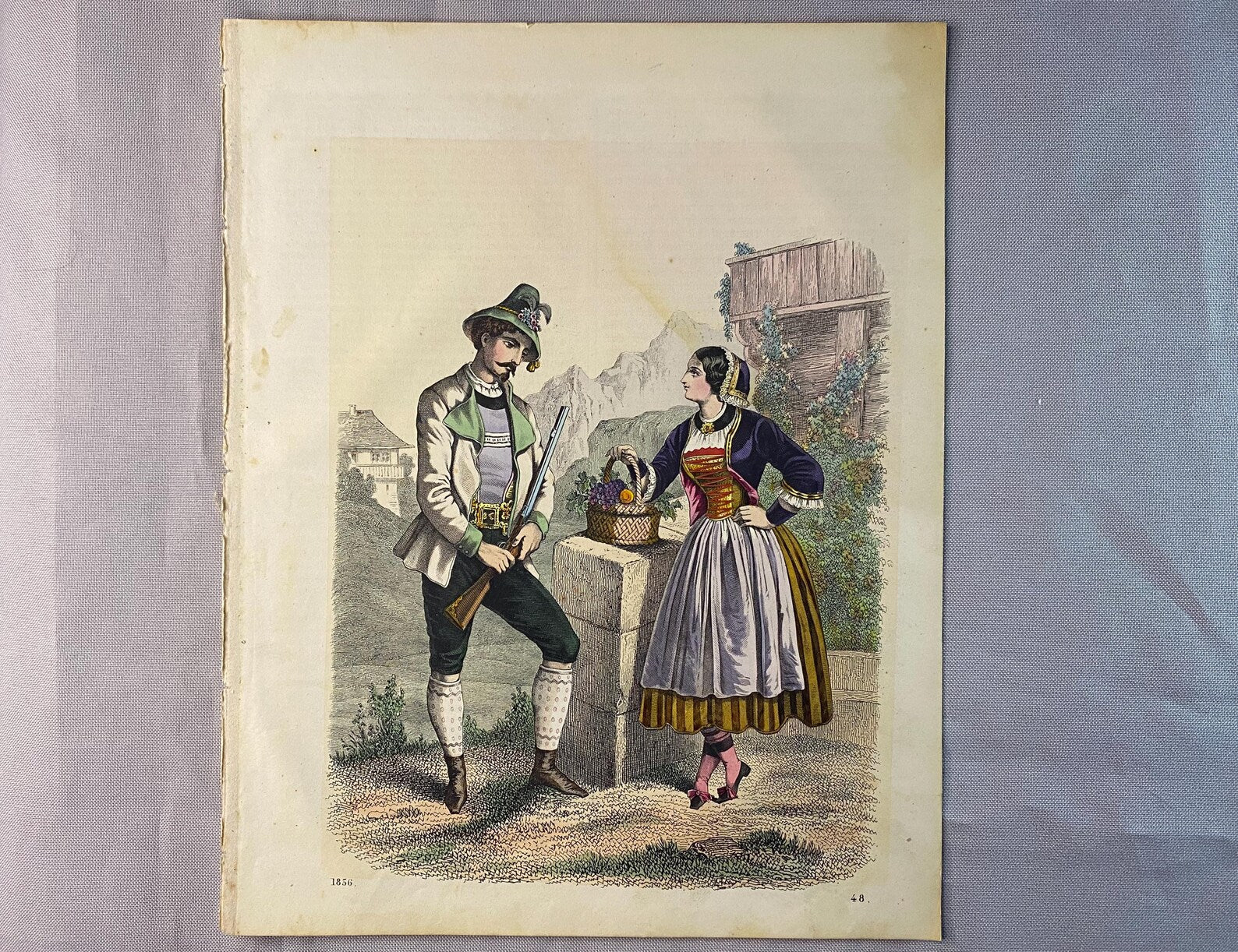 Original Farblithografie von 1856 mit detailreicher Darstellung eines Tiroler Paares in traditioneller Tracht. Links ein junger Mann mit Jagdgewehr, Federhut und bestickten Strümpfen, rechts eine Frau mit Korb, Mieder und festlicher Schürze. Im Hintergrund sind eine alpine Landschaft und Bauernhäuser angedeutet, die das ländliche Leben der Alpenregion um 1850 lebendig widerspiegeln.