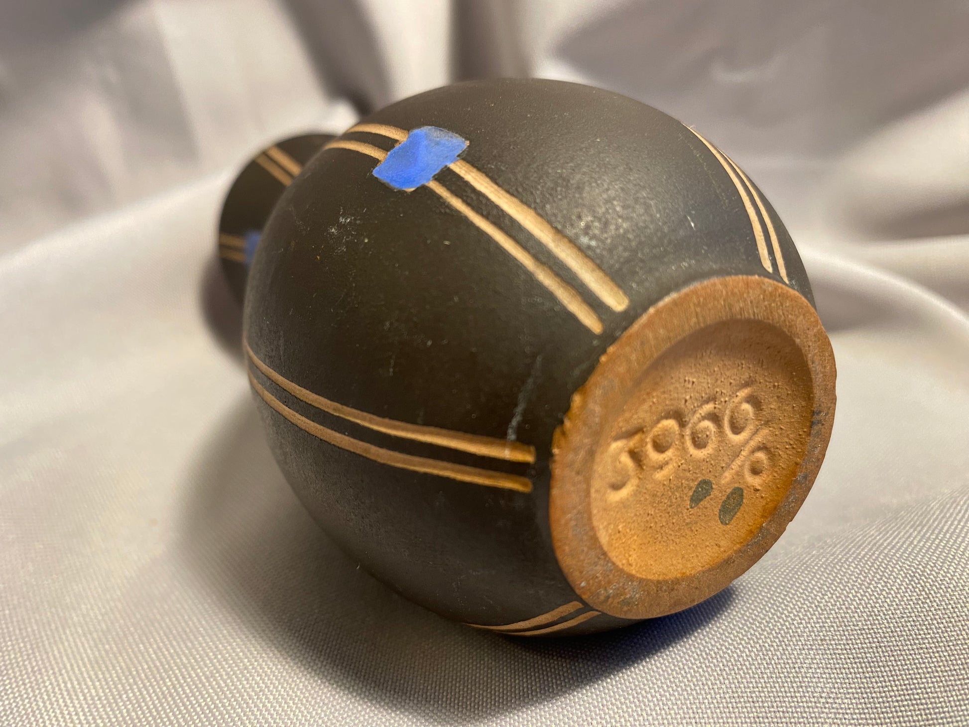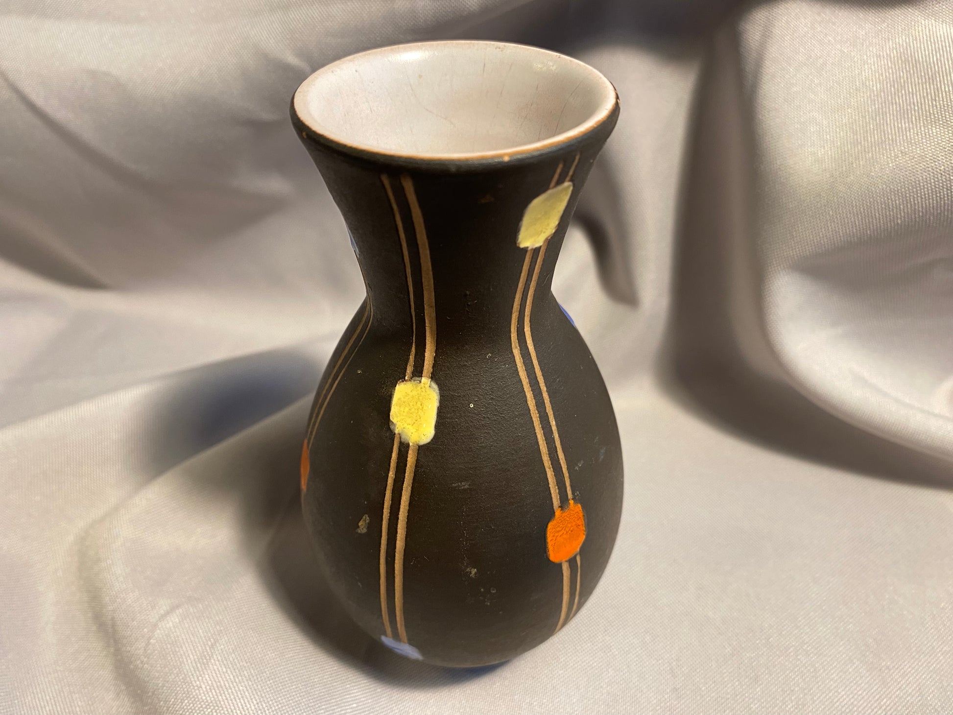 Diese elegante Vase repräsentiert den charmanten Confetti Stil der 1950er Jahre und stammt aus der renommierten Steuler Keramik-Manufaktur. Mit einer Höhe von 12,5 cm und einem Durchmesser von 7 cm fügt sie sich harmonisch in jedes Raumkonzept ein. Die schwarze Außenfarbe mit eingestreuten bunten Elementen bildet einen ansprechenden Kontrast zum weißen Inneren. Die Unterseite der Vase ist signiert mit der Nummer 3160/o. Trotz leichter Gebrauchsspuren, bleibt diese Vase ein exquisites Exemplar mit viel Charakter.