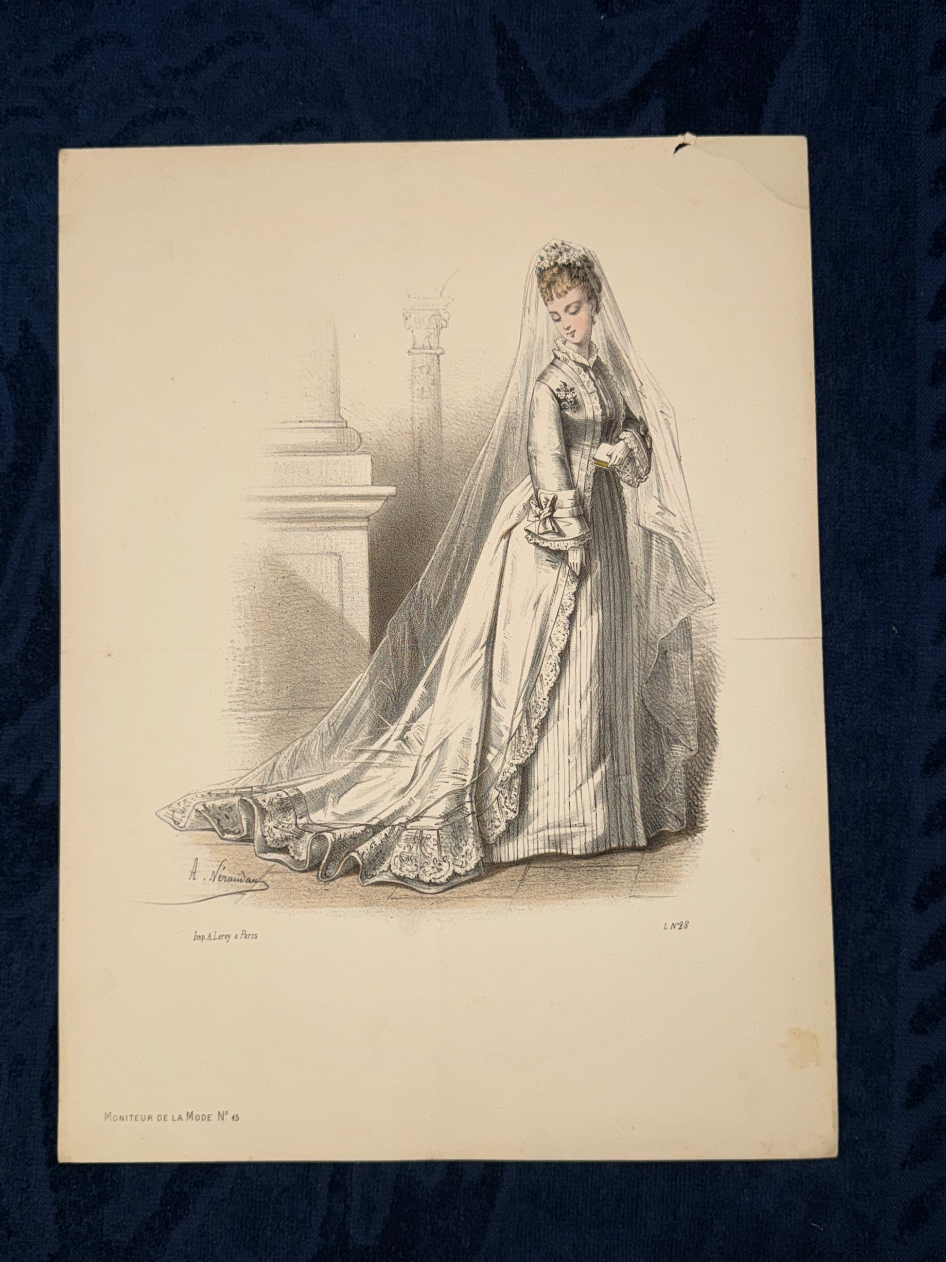 Seltene Originaldarstellung eines viktorianischen Hochzeitskleids aus der französischen Modezeitschrift „Le Moniteur de la Mode“, Blatt Nr. 63. Die Braut trägt ein prachtvolles bodenlanges Kleid mit feinen Längsstreifen, Volants und kostbarem Spitzenbesatz. Der lange Schleier mit Borte fällt elegant über Rücken und Schleppe. Die zurückhaltende, monochrome Darstellung (ohne Kolorierung) lenkt den Blick ganz auf Linienführung und Stoffstruktur. Die Szene spielt vor einem klassizistischen Architekturelement – ein zeittypisches Setting für Modegrafiken der 1870er Jahre.