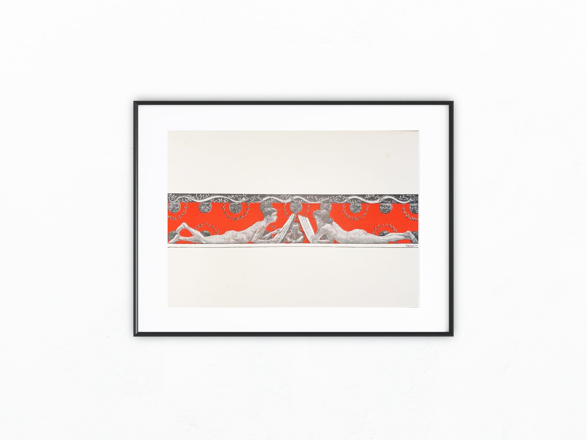 Dekorativer Jugendstildruck, entstanden um 1900. Die Darstellung zeigt zwei symmetrisch angeordnete nackte Jünglinge, die ein aufgeschlagenes Buch halten. Der kräftige rote Hintergrund mit Lorbeerkranz-Ornamenten und schwarzem Abschlussband verleiht dem Blatt einen besonders modernen, grafischen Charakter. Ein eindrucksvolles Beispiel für die ornamentale Bildsprache der Zeit.