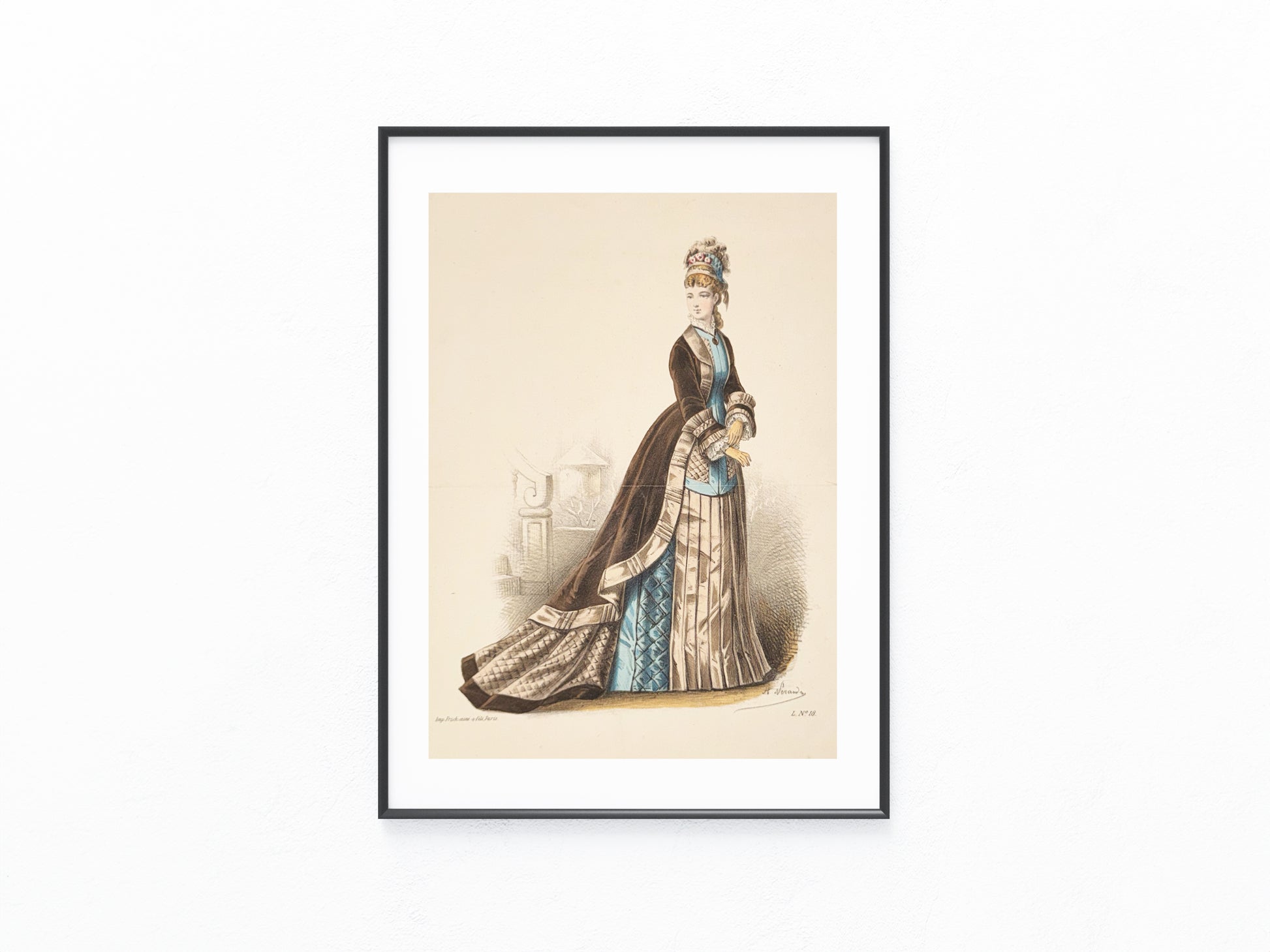 Fein koloriertes Modeblatt aus der französischen Zeitschrift Le Moniteur de la Mode, Nr. 2, um 1870. Die elegante Dame trägt eine mehrlagige Robe in Braun mit aufwendig strukturierter Vorderpartie in Türkis und Beige. Der Look wird ergänzt durch eine aufrechte Frisur mit floraler Federhaube und gelbe Handschuhe. Im Hintergrund sind Stufen oder ein Terrassenmotiv angedeutet – ein typisches Stilmittel der damaligen Modegrafik.