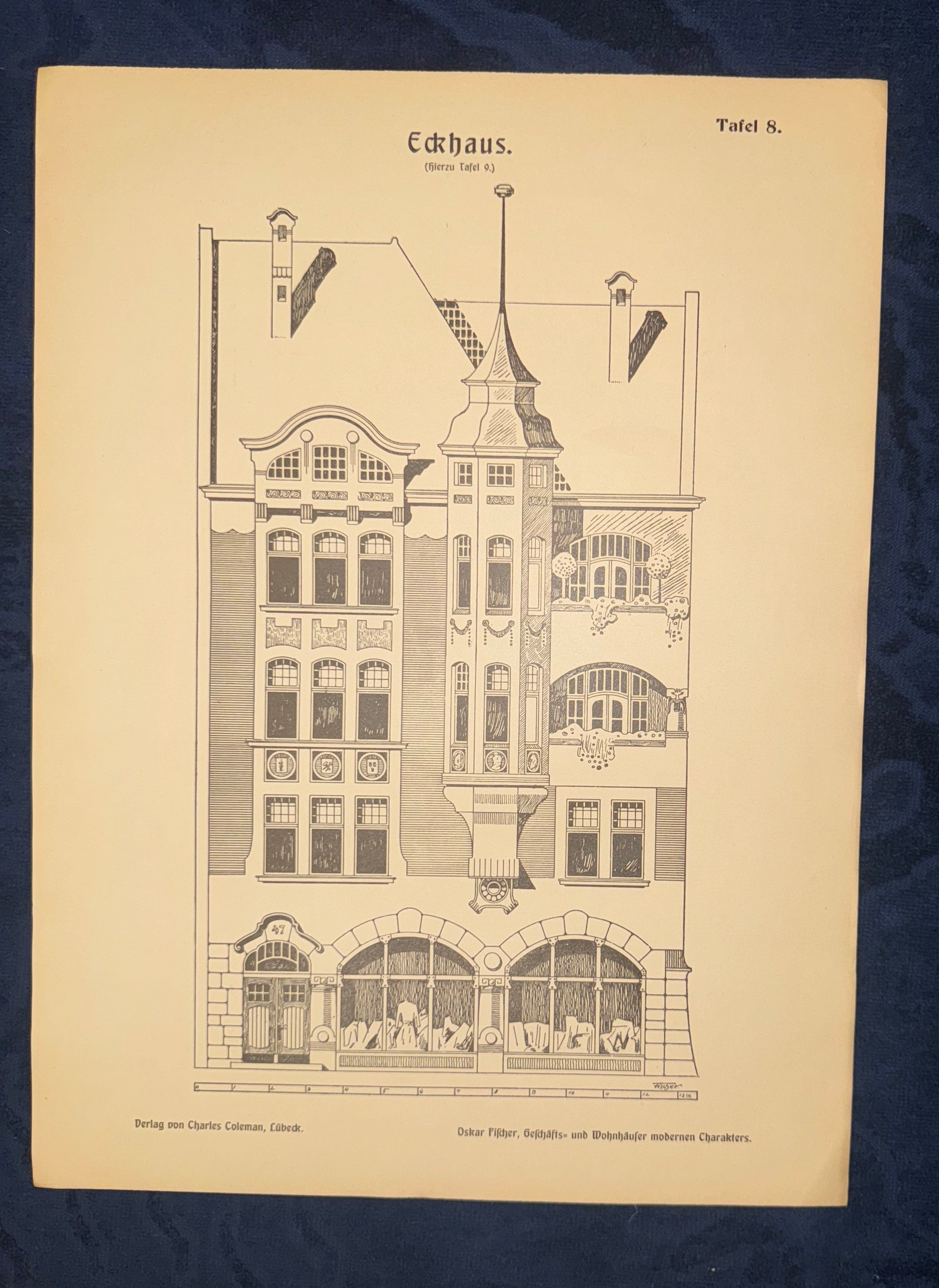 Fein ausgearbeitete Architektur-Tafel „Eckhaus“, um 1900 erschienen im Verlag Charles Coleman, Lübeck. Gezeigt wird ein imposantes Jugendstil-Eckgebäude mit geschwungener Fassadengliederung, markantem Turmaufbau, großen Fensterreihen und dekorativen Balkonen – ein charakteristisches Beispiel repräsentativer Architektur dieser Epoche.