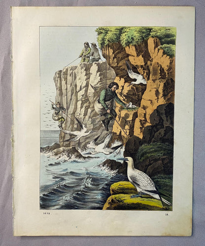 Original Farblithografie von 1858 mit eindrucksvoller Darstellung einer Vogeljagd/Eierjagd an einer Felsenküste. Mehrere Jäger seilen sich von den steilen Klippen ab, während andere von oben sichern. Um sie herum kreisen Seevögel, während die Brandung am Fuß der Felsen aufschäumt. Die detailreiche Szene verbindet dramatische Naturdarstellung mit Einblicken in historische Jagdmethoden.